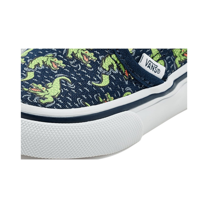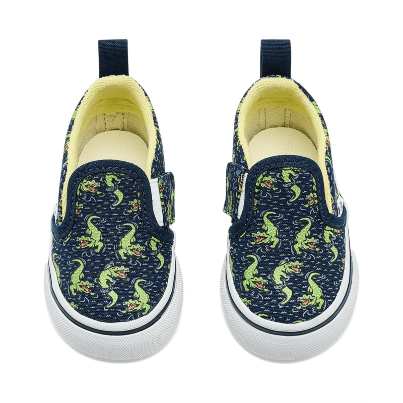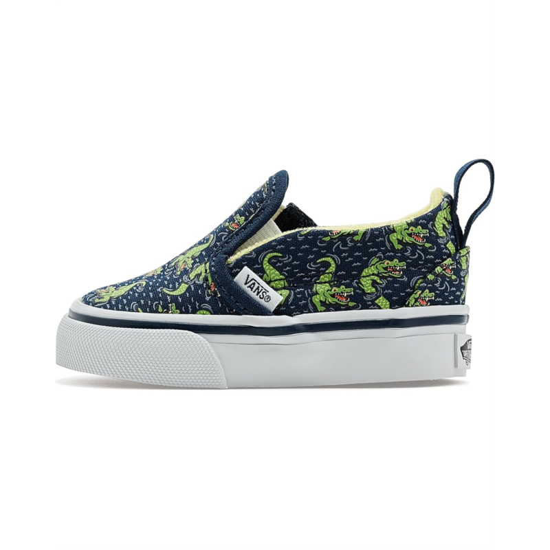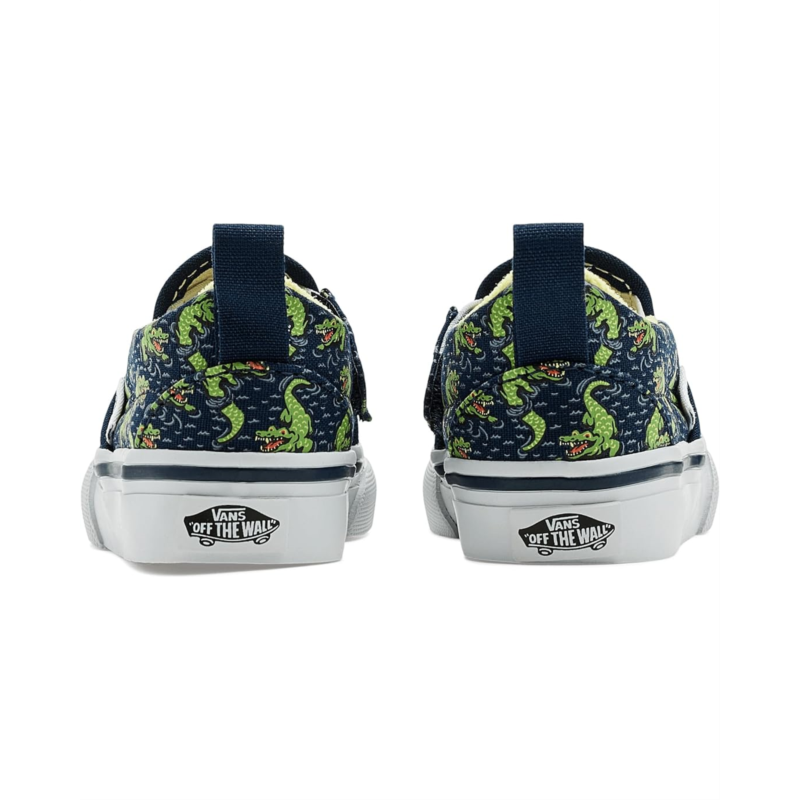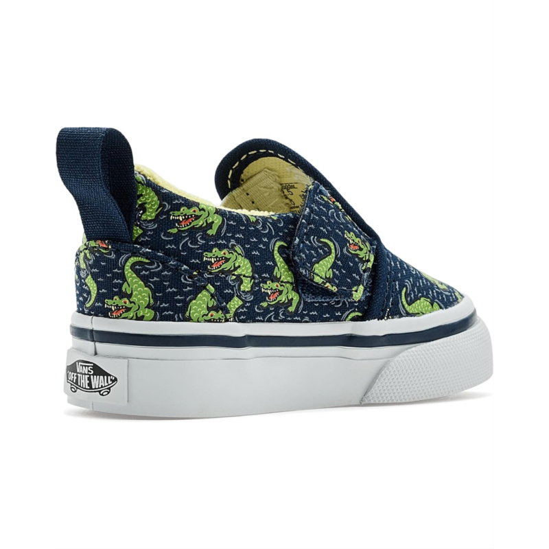 - The Vans Kids Slip-On V is designed for durability, comfort, and easy wear. Built with a canvas upper for a classic look and long-lasting strength, it also features a padded collar that enhances support and cushioning for little feet. The shoe is equipped with a side hook-and-loop strap closure, making it simple to put on and take off, while still ensuring a secure fit.