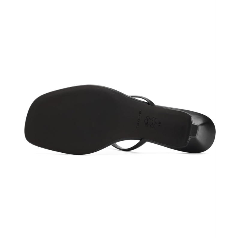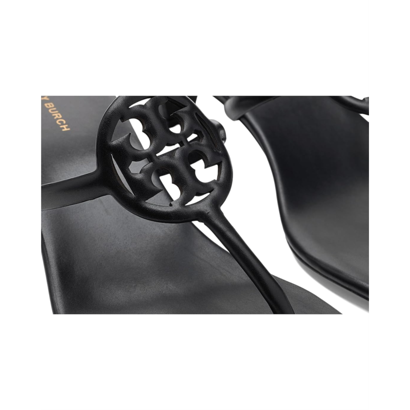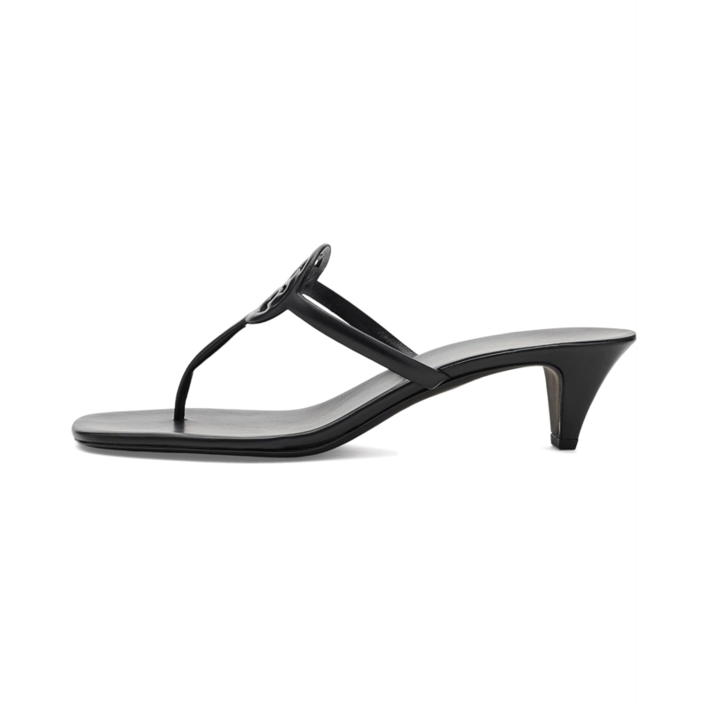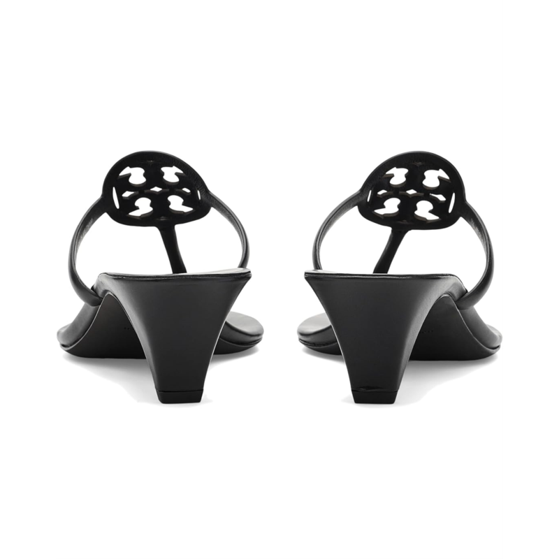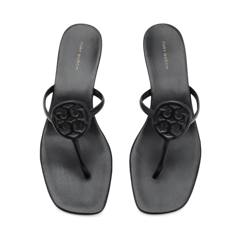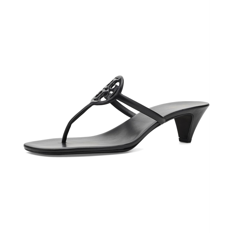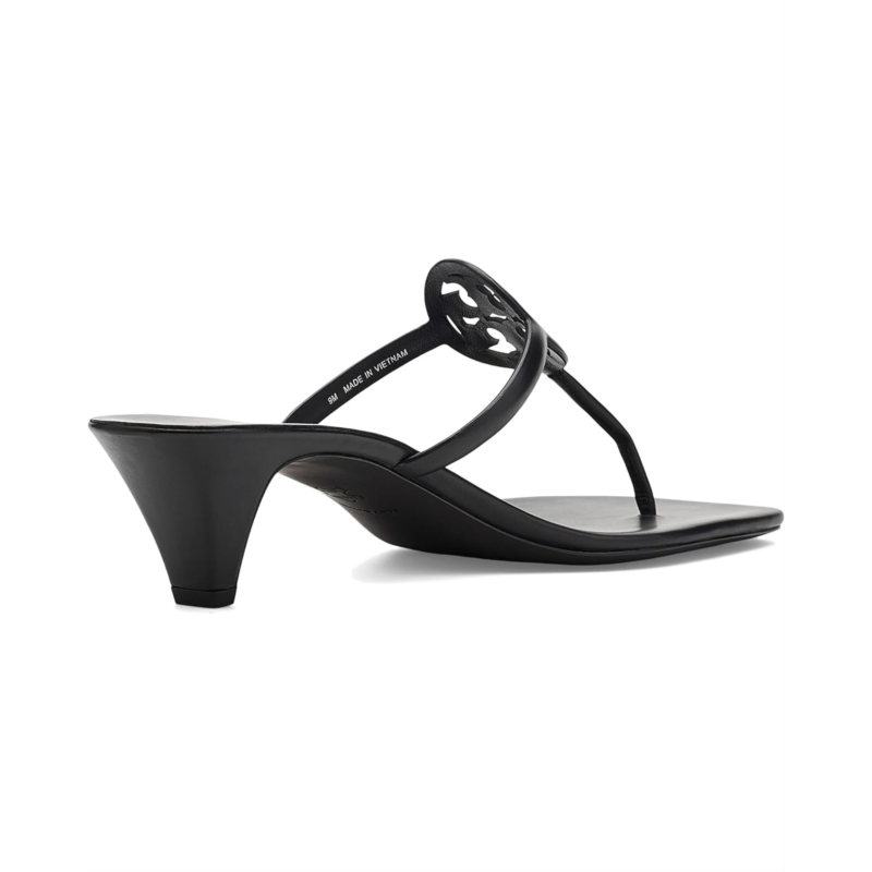 - Sleek and sophisticated, the Tory Burch 50mm Miller Capri Kitten Heel is designed to elevate your everyday look. Featuring the iconic T-monogram, this thong sandal is styled with slim straps for a minimalist, elegant feel.