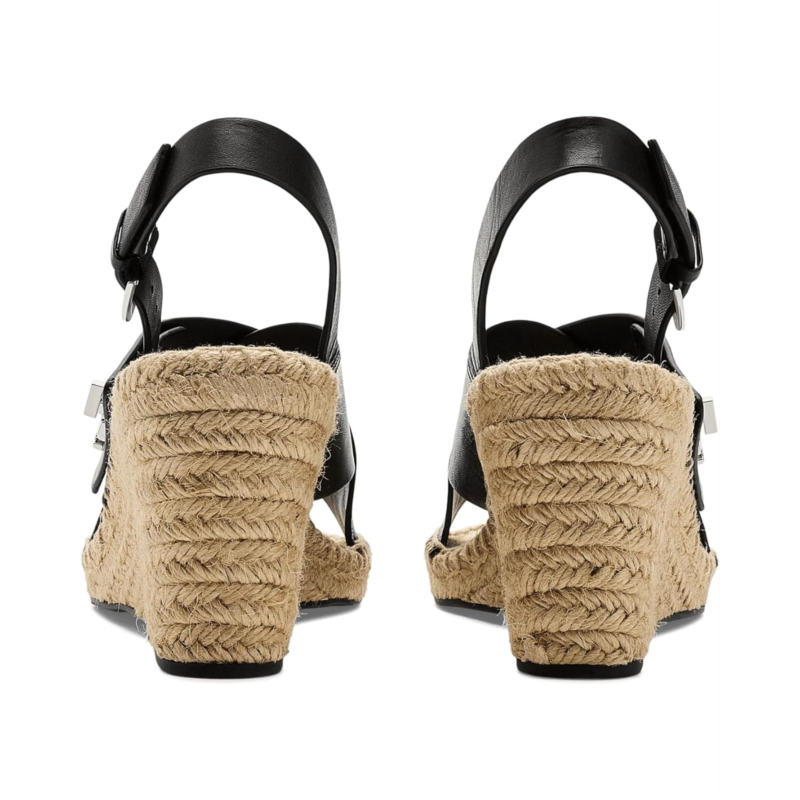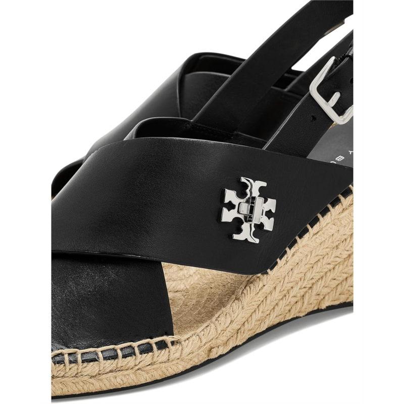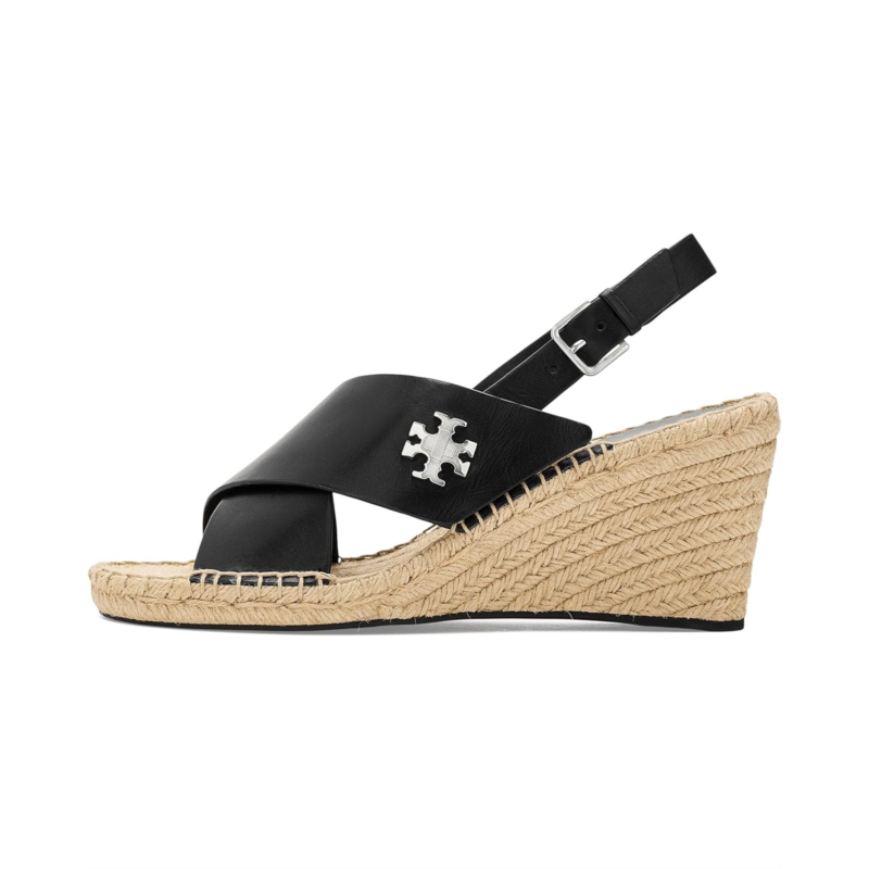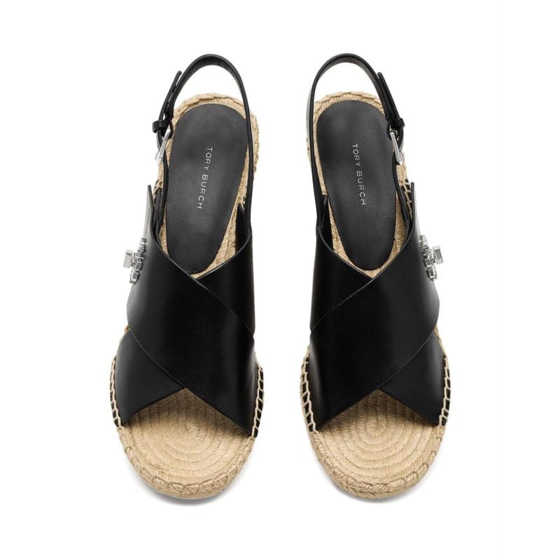 - Step into the effortless sophistication of the Tory Burch 85mm Turnlock Wedge Espadrille. The low-top style features crossover leather straps with decorative turnlock hardware and a jute wedge heel for a classic warm-weather look. An adjustable buckle closure provides a secure fit.