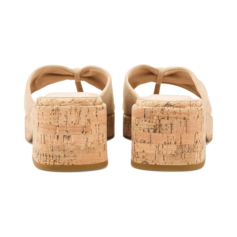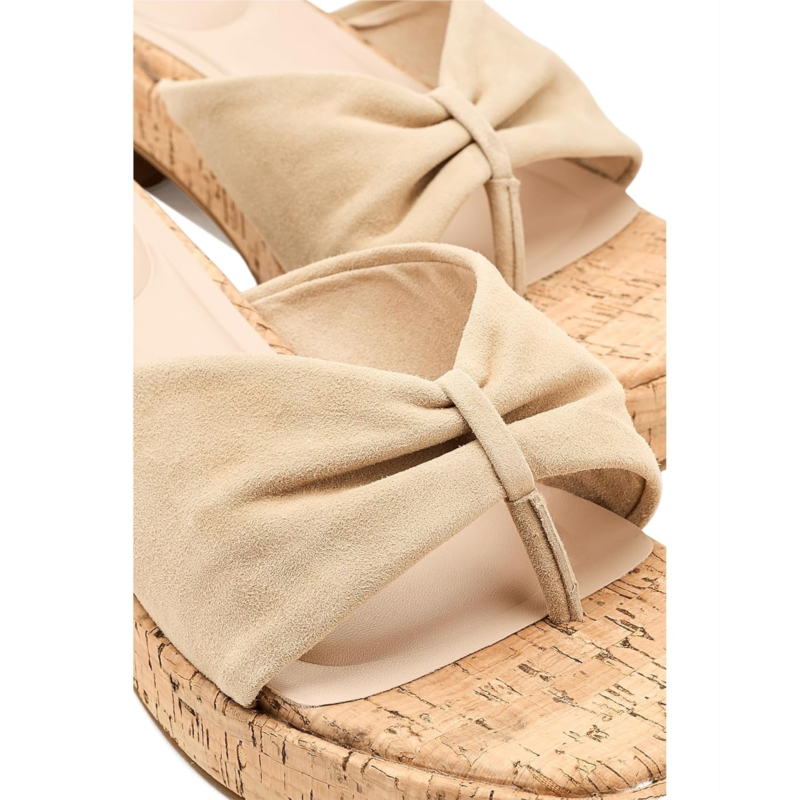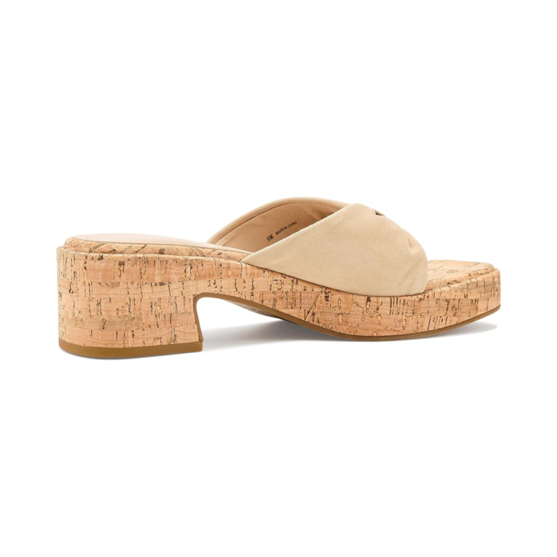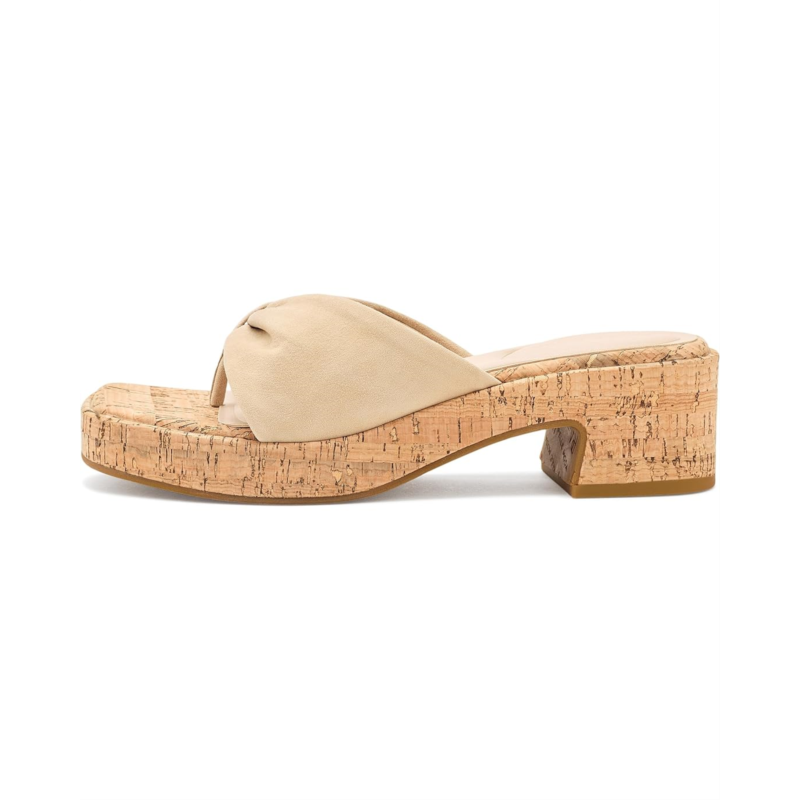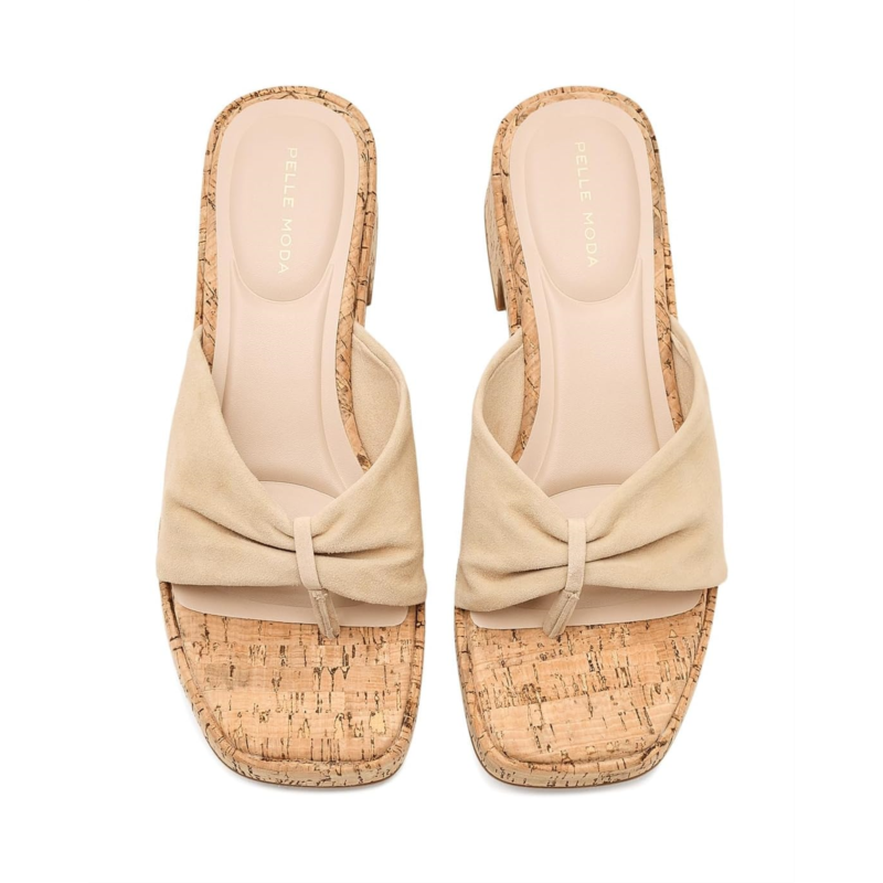 - The Pelle Moda Bandi sandals feature a clean, minimalist silhouette with a softly sculpted leather upper that gently cradles the foot. Their single, wide strap is crafted from supple suede, offering a refined texture and a relaxed yet polished feel. Set atop a contoured footbed, the design is supported by a natural cork platform that adds both visual interest and lightweight comfort. These heeled sandals are designed with a foam insole and a faux leather lining. The subtly flared block heels provide stability and an easy lift, while their smooth rubber outsole ensures effortless wear from day to evening. The overall look is modern and understated, balancing casual ease with elevated craftsmanship.