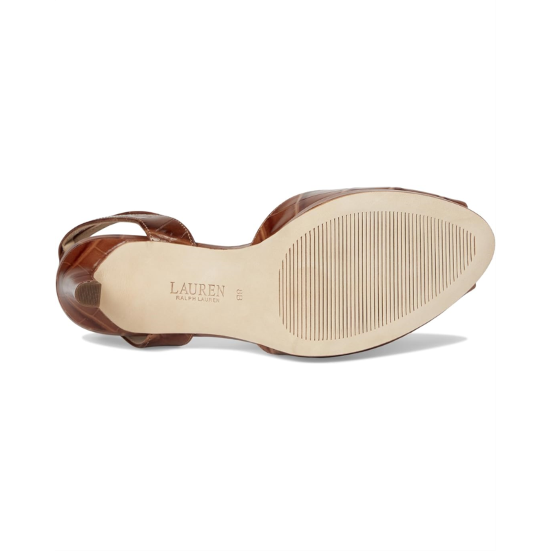 - Glossy crocodile-embossed leather brings subtle dimension and a luxurious sensibility to the Lauren Ralph Lauren Kyla Crocodile-Embossed Leather Sandals, which is equipped with stiletto heels for a leg-elongating effect. A crisscross ankle strap and peep toe design add modern appeal, while padded insole offers comfort with each step.