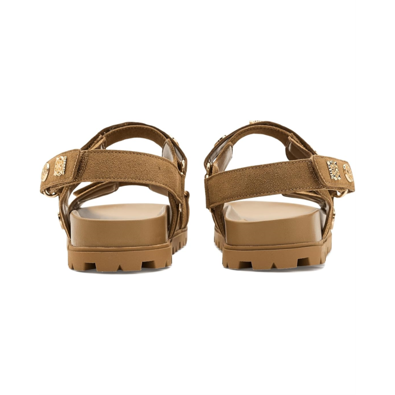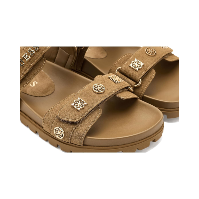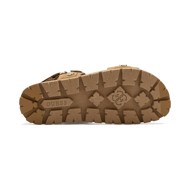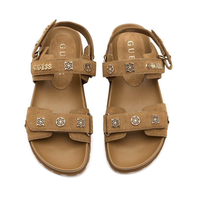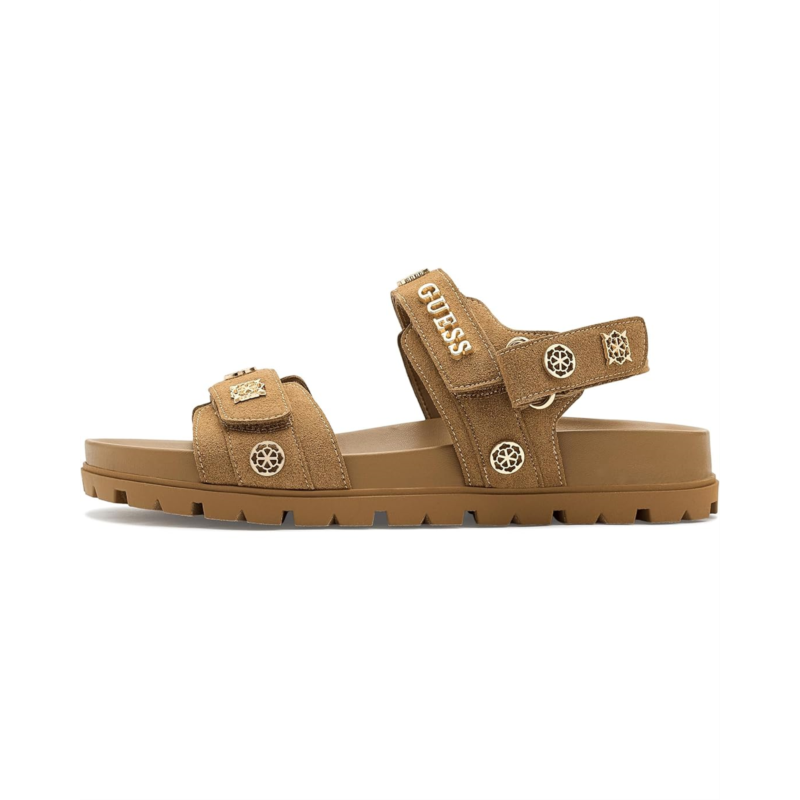 - The GUESS Florizi Sandal is a chic style that blends modern elegance with everyday wearability. Designed with a strappy silhouette, it features a comfortable footbed, secure hook-and-loop closure, and a lightweight rubber outsole for easy movement. Finished with signature GUESS detailing, the Florizi Sandal delivers versatile appeal.