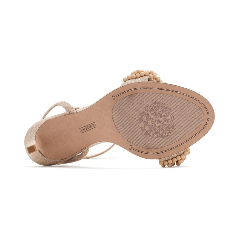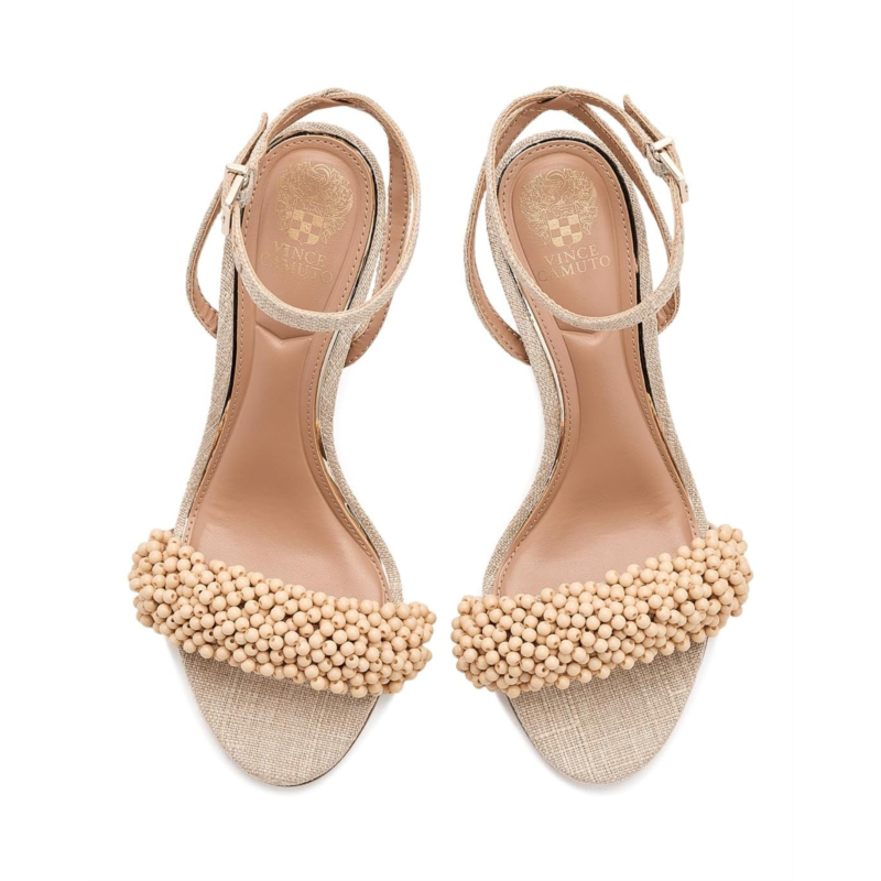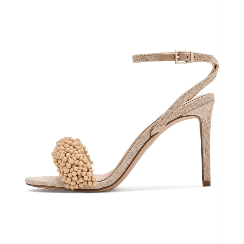 - The Vince Camuto Arleem Beaded Band Ankle Strap High Heel Sandals feature a slim ankle strap with a buckle closure and a high stiletto heel for a sleek silhouette. Its standout detail is the beaded embellishment on the front strap, adding a touch of sophistication and femininity to the design.