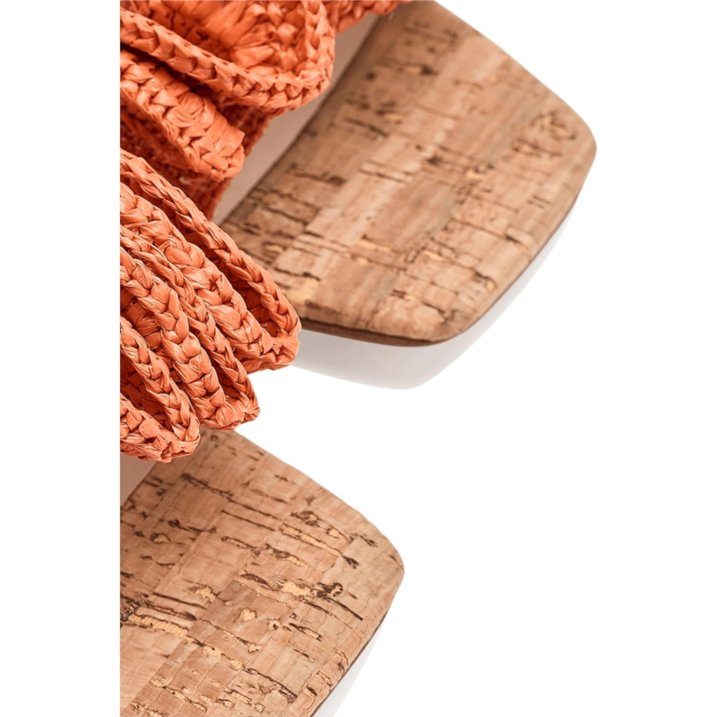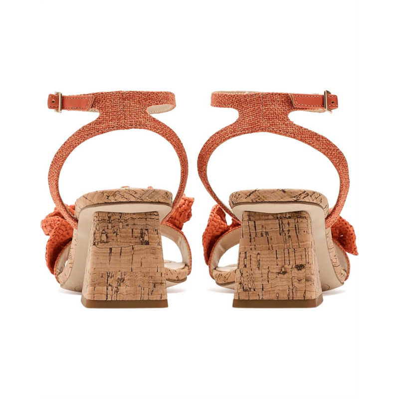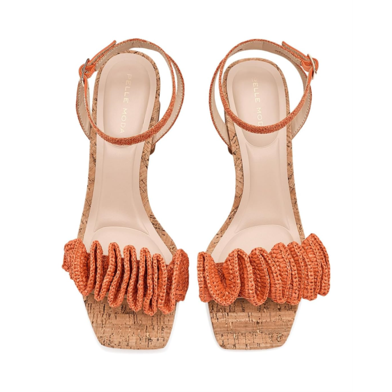 - This Pelle Moda Tiann heeled sandal brings an artisanal, feminine touch to a clean, contemporary silhouette. The design features a softly sculpted front strap adorned with a layered woven rosette, adding texture and visual interest while keeping the look refined. A slim ankle strap with an adjustable buckle closure provides a secure, flattering fit, complemented by a gently cushioned footbed for comfort. The block heel is crafted from natural cork, offering stability and an organic contrast to the textured upper. Elegant yet relaxed, this sandal is an effortless choice for warm-weather occasions that call for elevated ease.