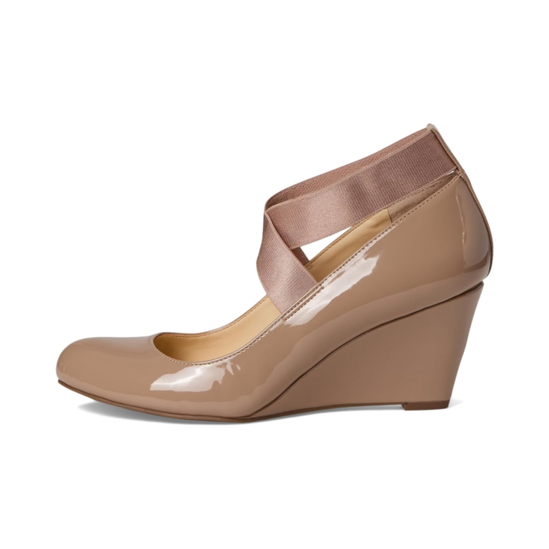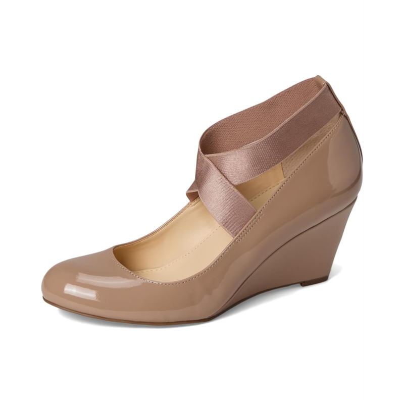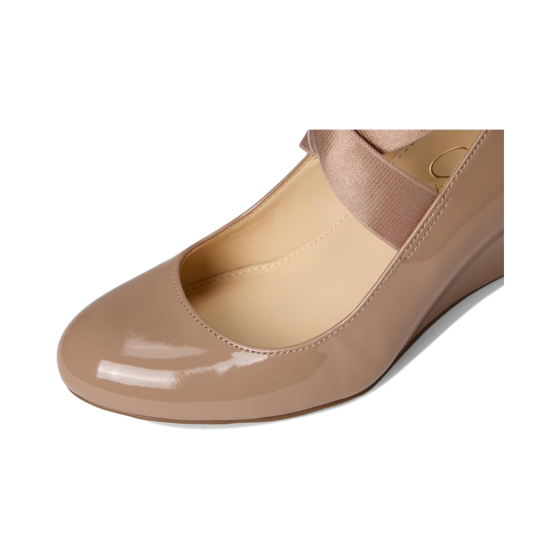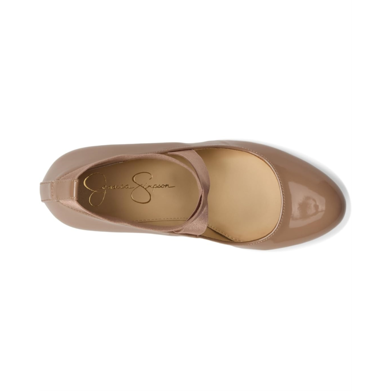 - Make every step shine with sleek flair wearing the Jessica Simpson Saedra Dress Wedge Pumps. With an almond toe silhouette, the pull-on footwear features polyurethane upper, elasticized crisscross strap, and stacked wedge heel for a supportive uplift.