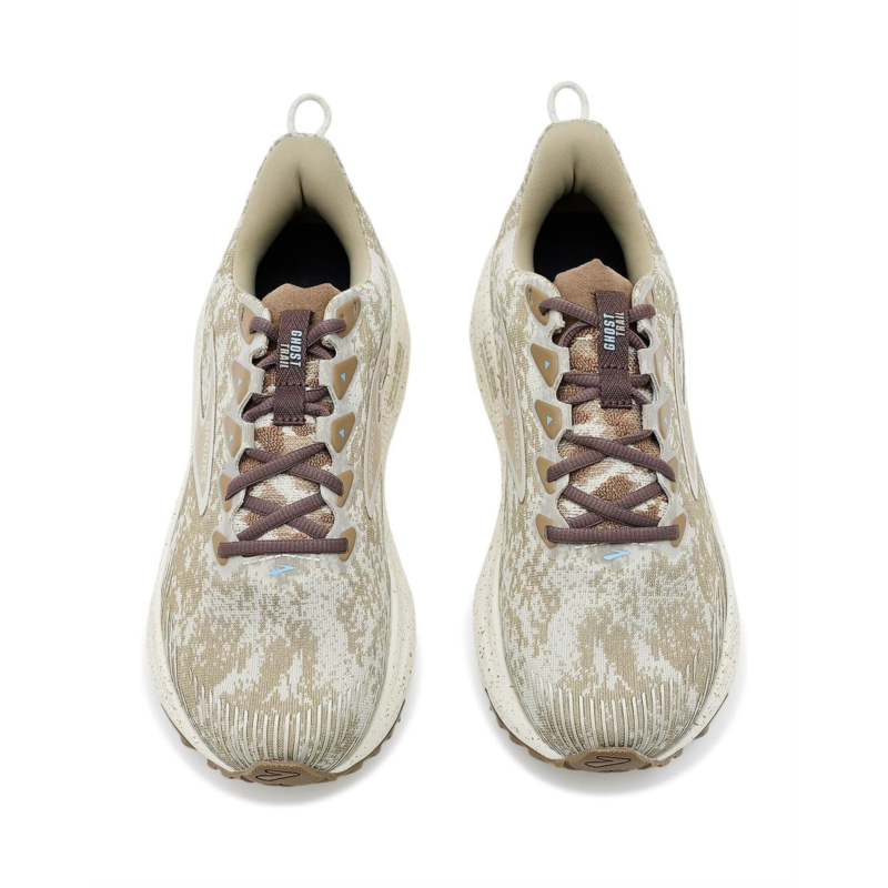 - The Brooks Ghost Trail is a trail-ready shoe, offering plush cushioning, rugged traction, and waterproof protection for off-road adventures. Designed for runners who love the soft ride of the Ghost but need trail-specific features, the Ghost Trail combines DNA LOFT v2 cushioning with a TrailTack rubber outsole for grip on wet and dry surfaces. The upper is reinforced with durable overlays and a protective toe cap, while the segmented crash pad ensures smooth heel-to-toe transitions even on uneven terrain.