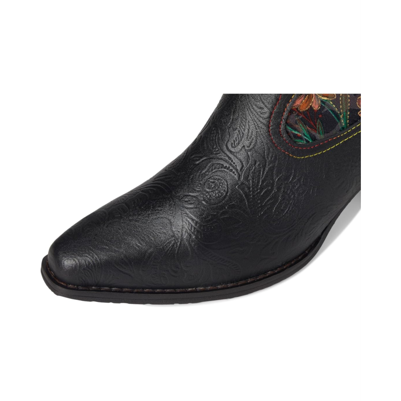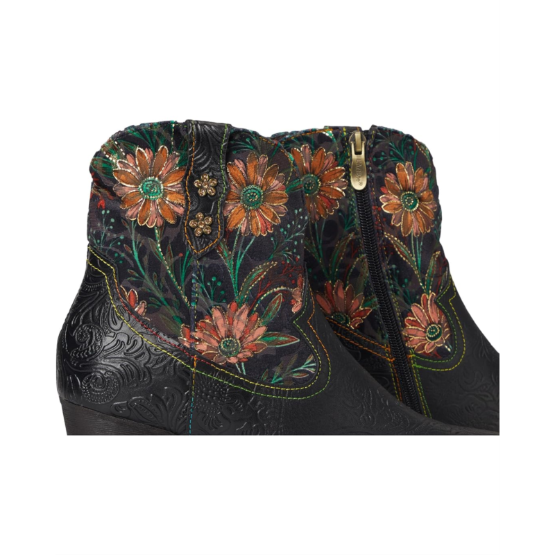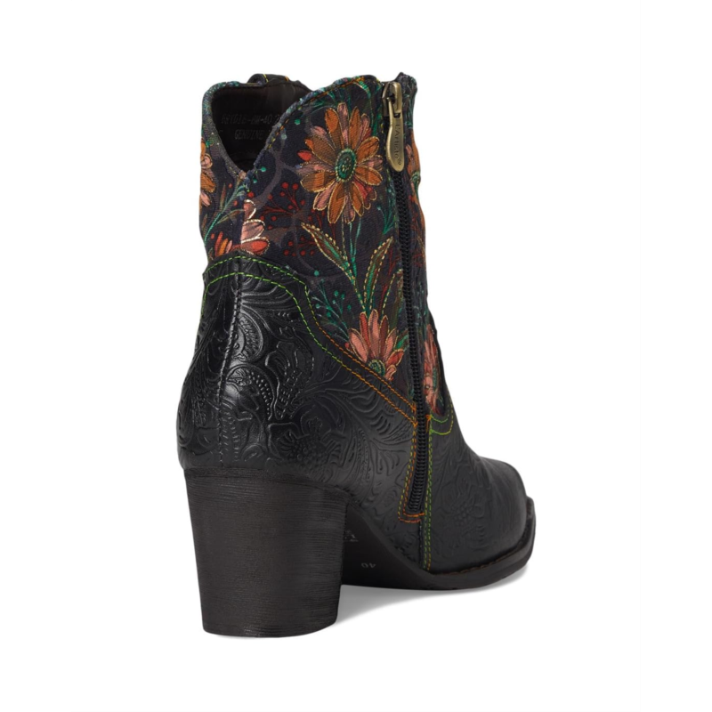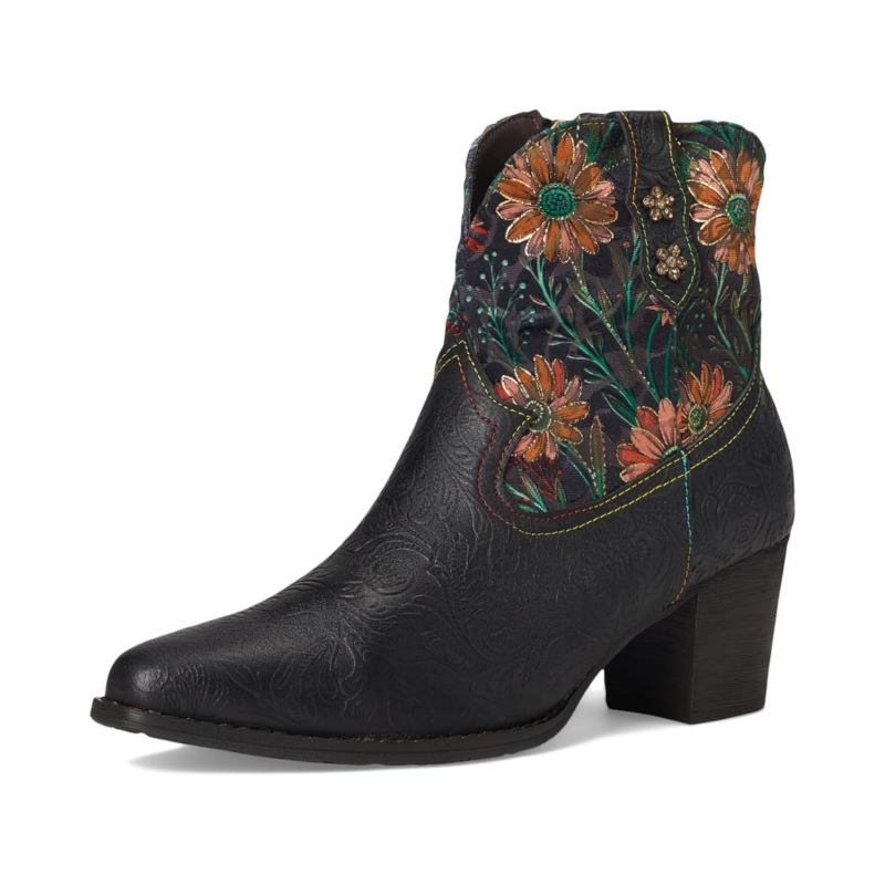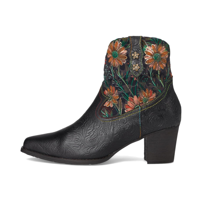 - Embrace the perfect fusion of Western charm and artistic flair with this stunning LArtiste by Spring Step Brydie ankle boot. Crafted with a luxurious leather combo upper, it features intricate floral embroidery and embossed detailing for a truly unique look. The sleek, snip toe and faux stacked heel give it a classic cowgirl-inspired edge, while the zippered side closure ensures wearable ease. Designed for all-day comfort, this boot offers a cushioned insole and sturdy construction, making it a must-have for trendsetters who love a bold, chic statement.