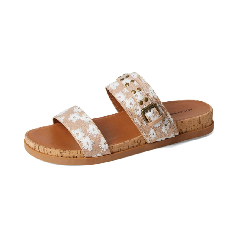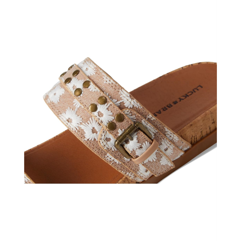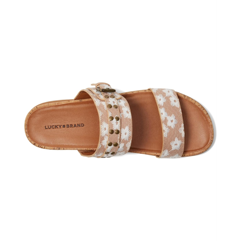 - The Lucky Brand Dineesa Studded Two Band Flat Sandals are a stylish and edgy addition to your footwear collection. Featuring polished studs and double-band straps, these slip-on sandals bring a modern attitude to your warm-weather looks. Designed with a cushioned footbed, they offer comfort for all-day wear.