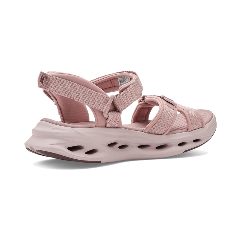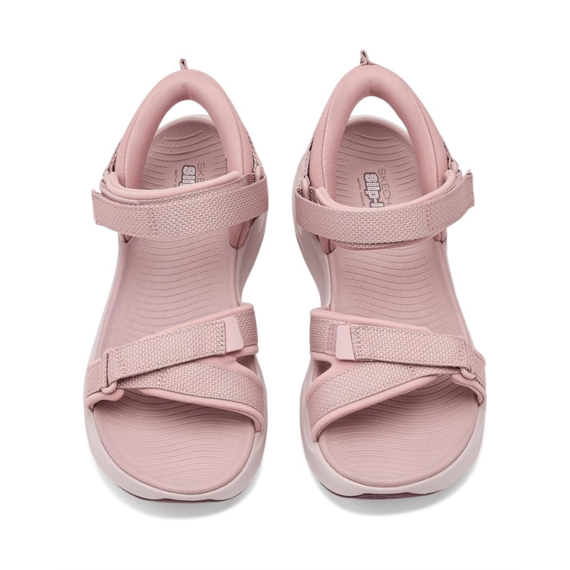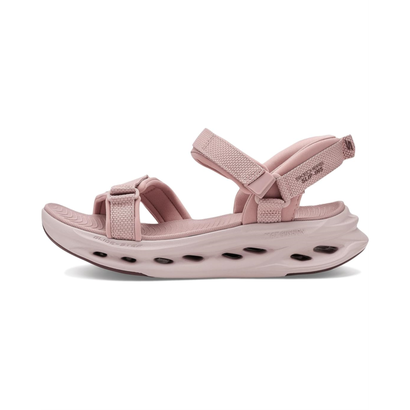 - Innovation in every stride, SKECHERS Performance On-The-Go Max Cushioning Glide-Step Sandals. Designed for people who never slow down, these performance-driven sandals feature a flexible spandex upper that gently adapts to your foot for a secure yet breathable feel. The soft polyester lining enhances comfort, keeping every step smooth and irritation-free. Engineered with an Ethylene Vinyl Acetate insole and outsole, the design delivers lightweight cushioning and shock absorption for long-lasting wear. Experience the magic of Skechers exclusive Heel Pillow technology that helps keep your foot comfortably in place, while the breathable Skechers Contoured Goga Mat comfort insole provides responsive support with every stride. The Glide-Step geometric midsole design promotes a smooth, energized transition from heel to toe. Finished with a convenient hook-and-loop backstrap closure for easy adjustability, these sandals bring together sporty functionality, modern comfort, and hands-free inspired convenience for everyday adventures.