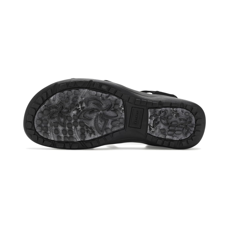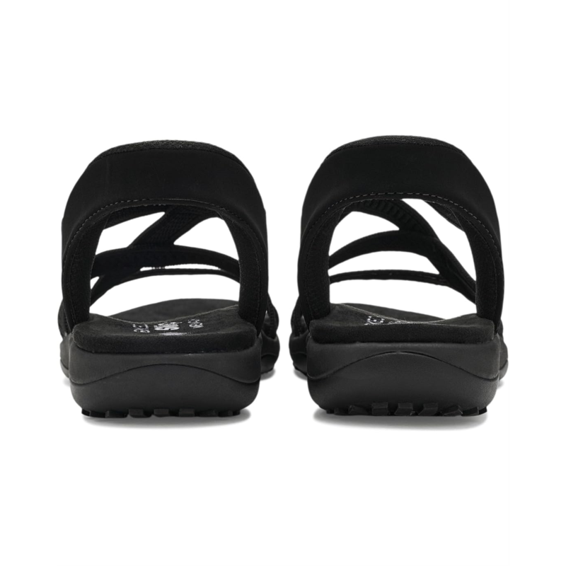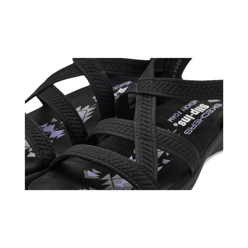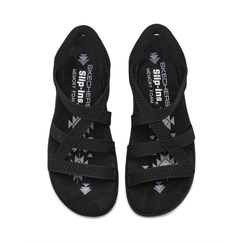 - Enjoy sunny days in breezy comfort with SKECHERS Reggae Slim - Hands Free Slip-ins. Designed with the Heel Pillow, this strappy sandal features a stretch fabric strap upper with a Skechers Hands Free Slip-ins back heel and cushioned footbed. It comes with open round roe, stretchable backstrap, low heel design, and brand detailing on the footbed.