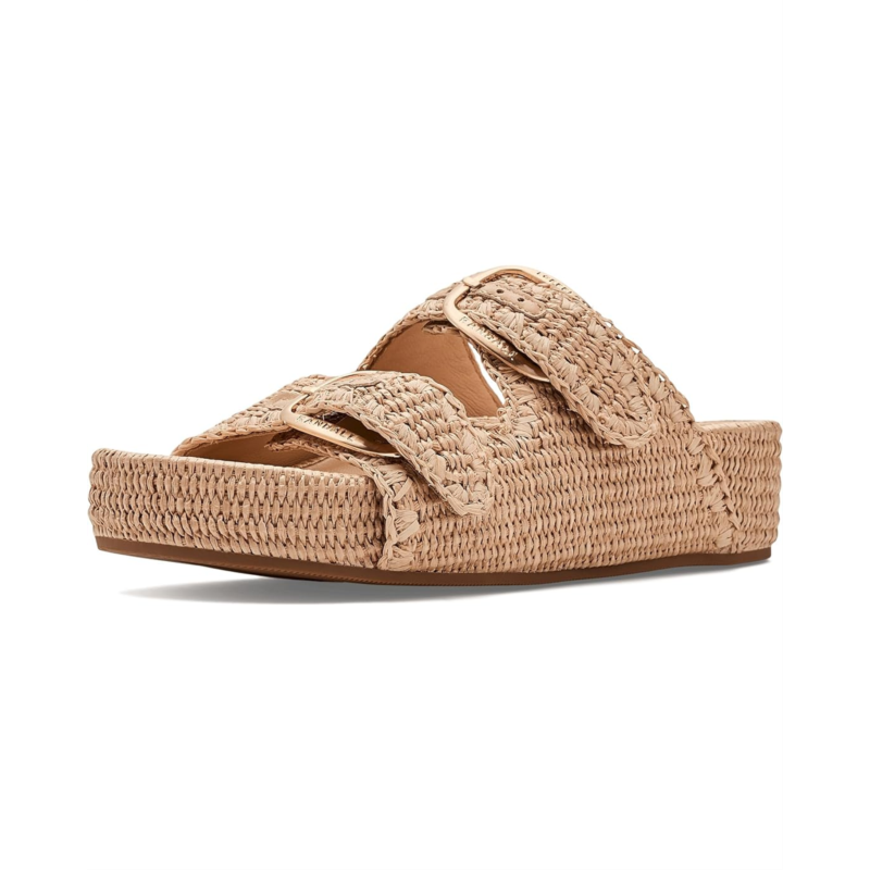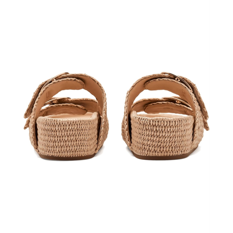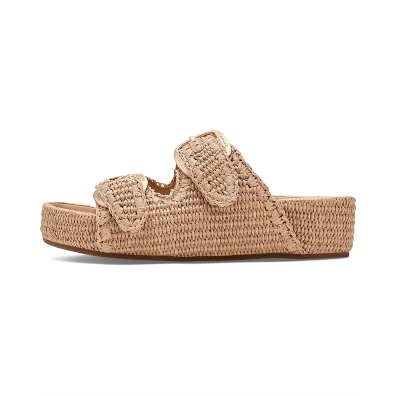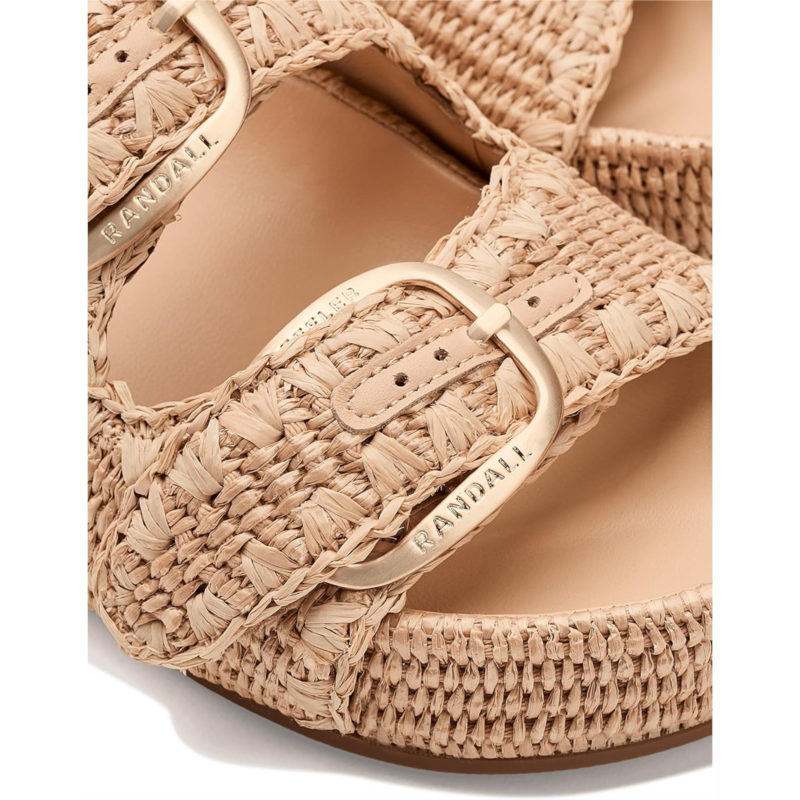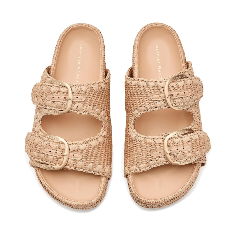 - The Loeffler Randall Nico Two Band Sandals offer a modern design with a minimal look. Crafted from a cotton upper, leather lining, and cotton insole, this pair of sandals features an open, rounded-toe design, slip-on style, and tonal whipstitch detailing. It highlights two large buckle hardware, a padded leather footbed, brand detailing on the footbed and hook-and-loop fastenings at the straps.