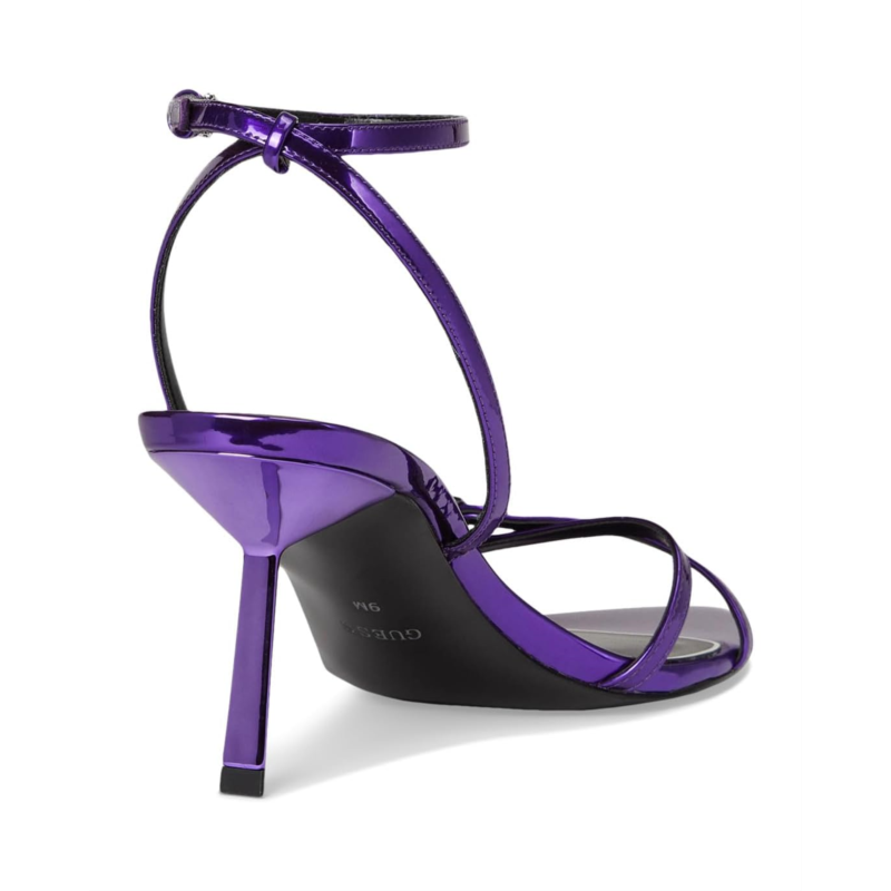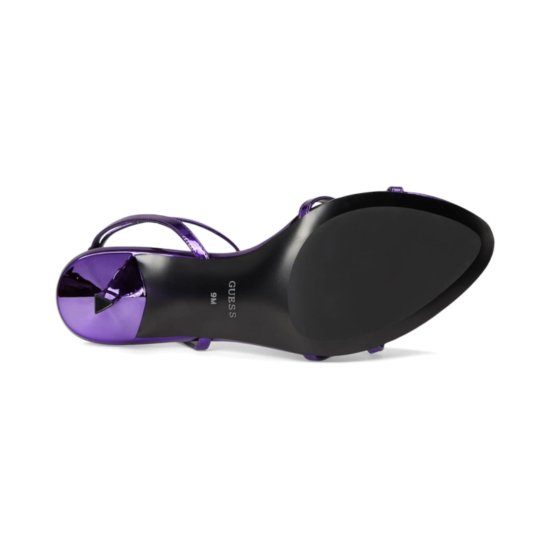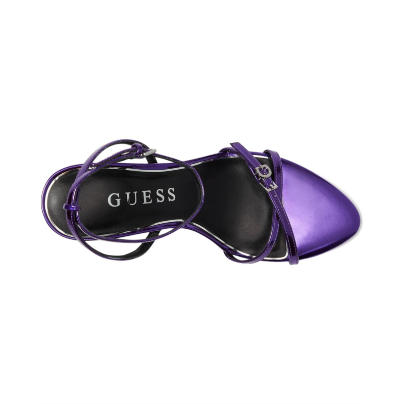 - Make a grand entrance styling GUESS Connee. Designed to steal the spotlight, this strappy dress sandal brings together sleek sophistication and all-day comfort. Crafted with a smooth leather upper and secured by an ankle-wrap buckle closure, it ensures a perfect fit while the open toe keeps the look chic and versatile. The front strap is elevated with the signature metal G ornament, a subtle nod to GUESS heritage style. A sculpted metal stiletto heel adds wearable height, making every stride confident and striking. Inside, a plush cushioned insole delivers lasting support, while the flex outsole moves seamlessly with you, ensuring comfort doesnt take a backseat to style.