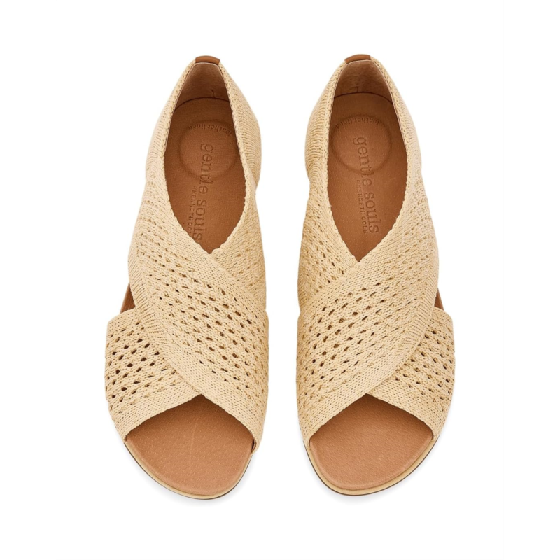 - The Gentle Souls by Kenneth Cole Laniey is designed for comfort and ease, distinguished by its wide, crisscrossing vamp straps and a stretch knit upper that adapts to the foot. Set on a well-cushioned footbed, it provides lasting wear and support, making it ideal for all-day use.