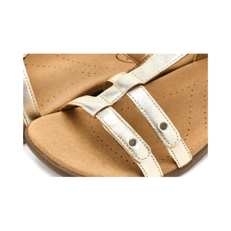 - Leather or metallic leather upper features metal hardware details in a strappy t-strap silhouette.