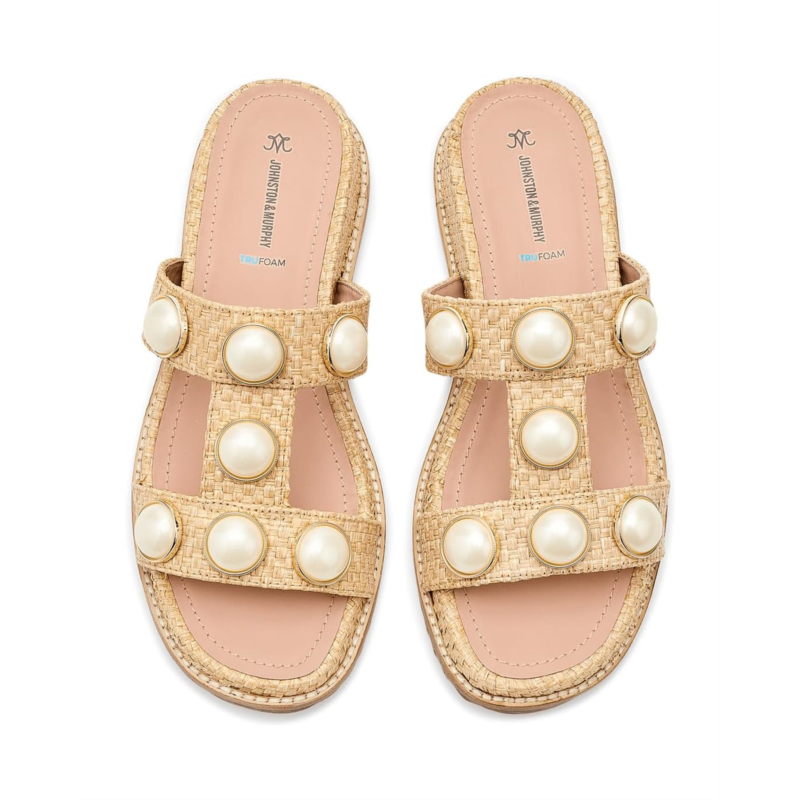 - Polished yet comfortable, the Johnston & Murphy Chandler Embellished Slides are designed to elevate everyday looks with ease. Crafted with a supple glove leather upper and smooth leather lining, this slide features a lightweight TRUFOAM molded footbed with built-in arch support for ultra cushioning and all-day comfort. A self-wrapped wedge with a platform adds subtle lift, while the rubber outsole provides reliable traction.