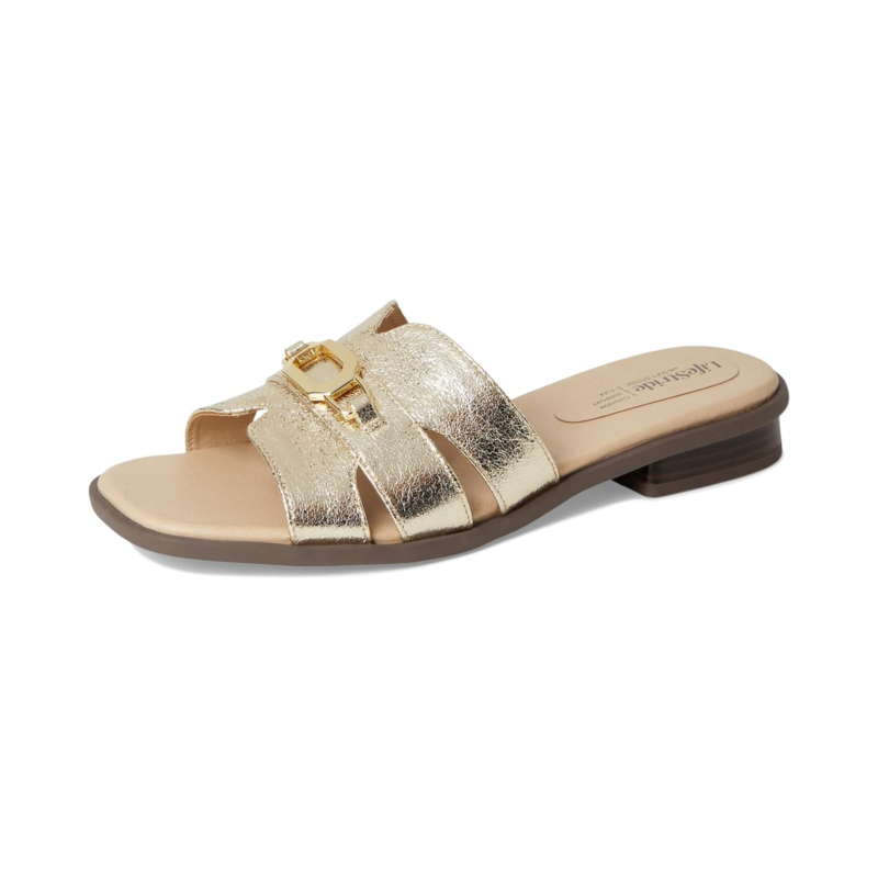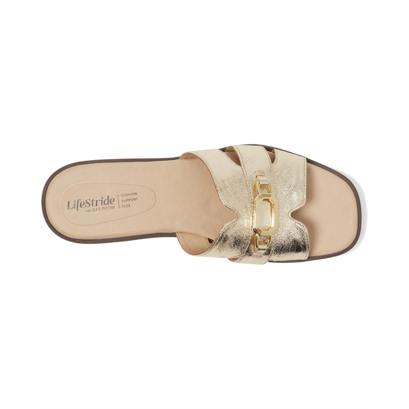 - Perfect for travel or every day, the LifeStride Royaltybit sandals are equally versatile, casual, and chic. Their polyester upper features an open square toe silhouette, slip-on fit, and metallic ornament detail while the trusted Soft System comfort technology provides unmatched cushion, support, and flexibility in every pair. These heeled sandals are made of a foam insole and polyurethane lining. The traction synthetic rubber outsole offers extra stability.