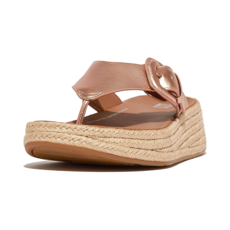 Elevate your comfort in true sense wearing the FitFlop F-Mode Espadrille Adj. Leather Flatform Toe-Thongs. It features leather upper, lining, and footbed. A sleek strap is cut to flatter the foot on a wedge heel. The thongs are crafted in soft shimmering metallic leather, with a leather-covered half-moon buckle.