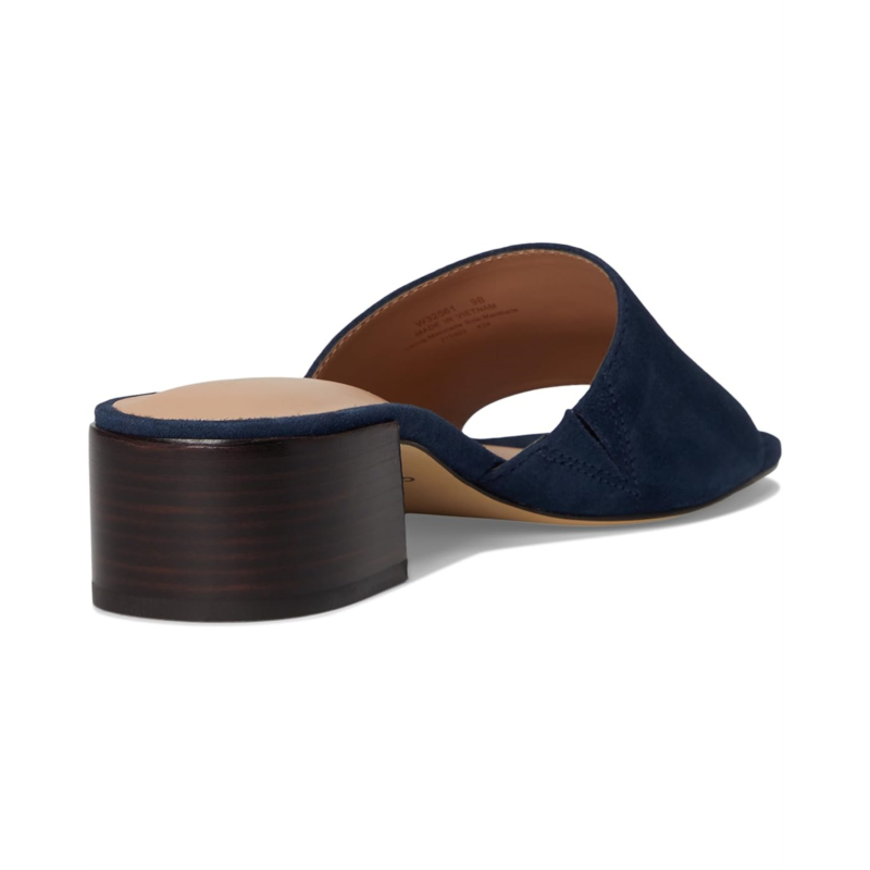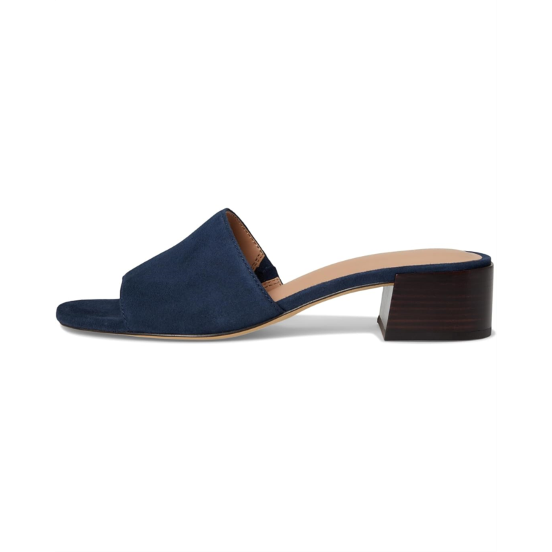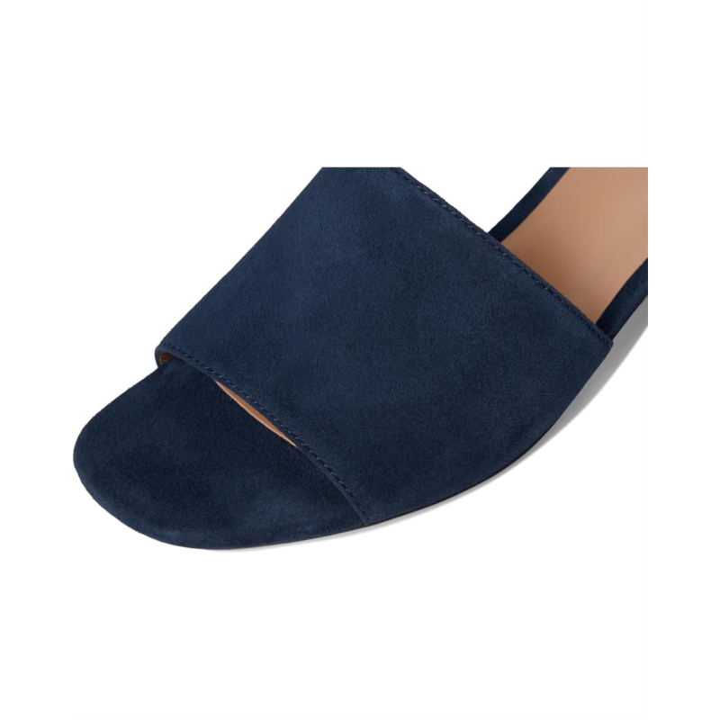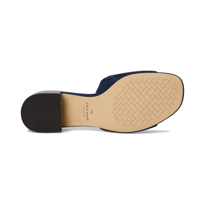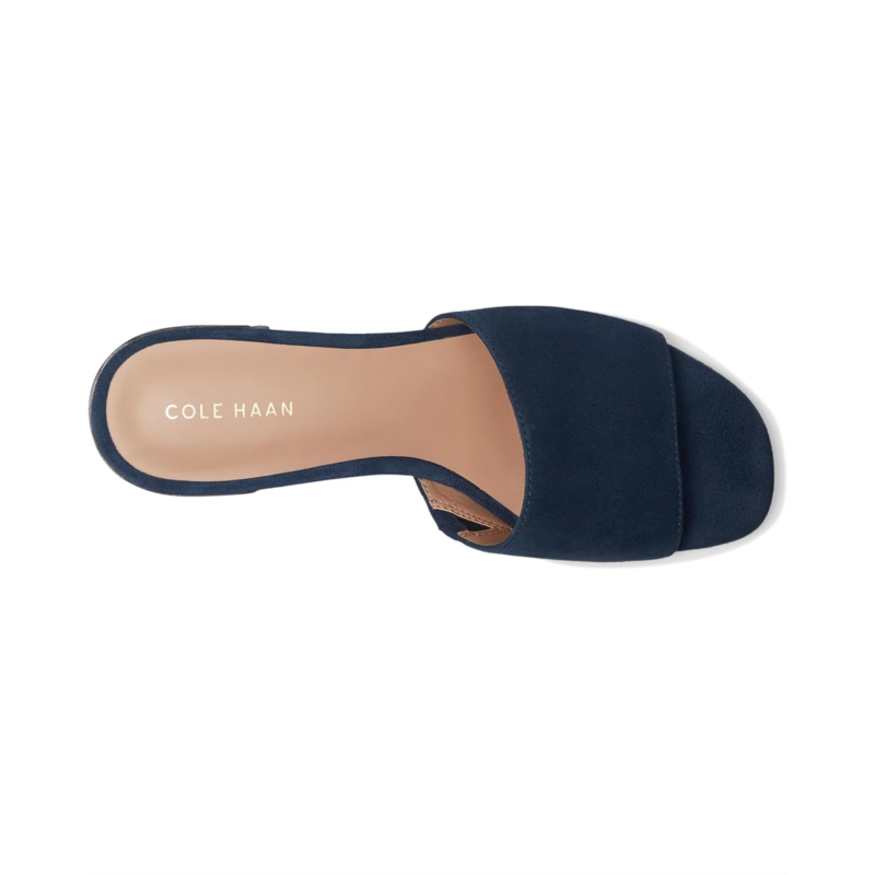 Slip your steps into supreme comfort wearing Cole Haan Calli Single Band Sandal. One band logo mule has sandal silhouette with a block heel. A leather and suede upper, textile lining, and cushioned comfort EVA insole make the shoes super breathable for outdoor walks. It has polyurethane lined midsole, 3D lux comfort sock, and wide vamp with a slip-on style; giving it updated look.