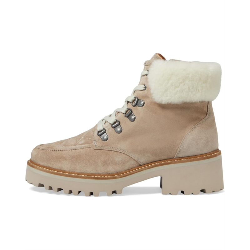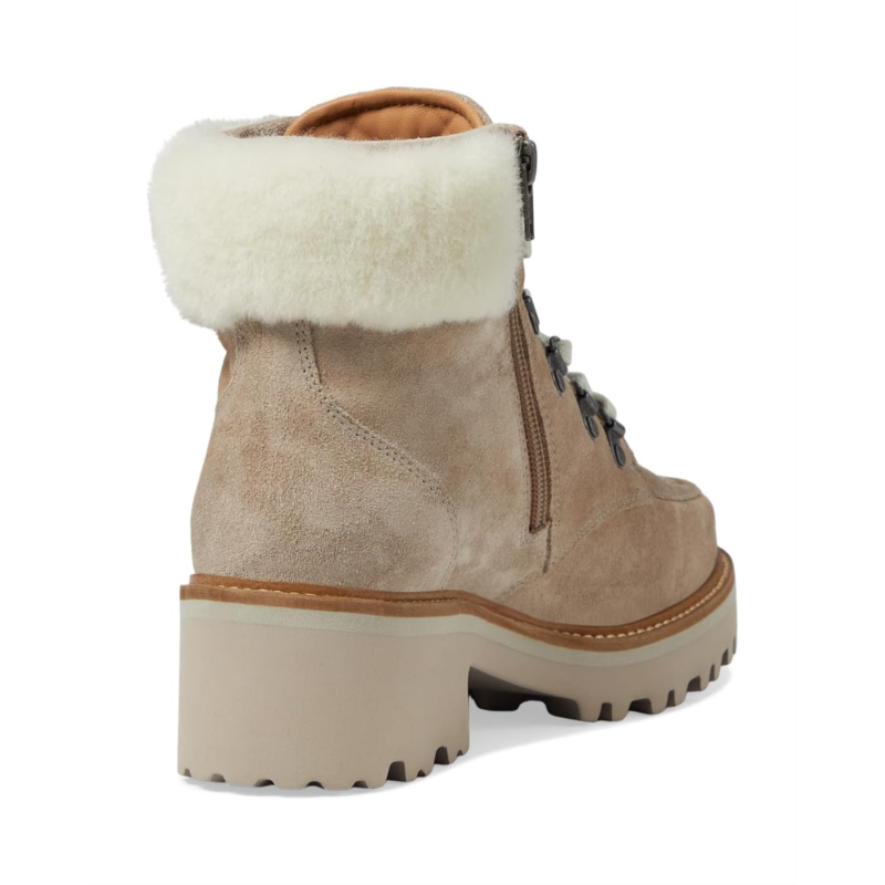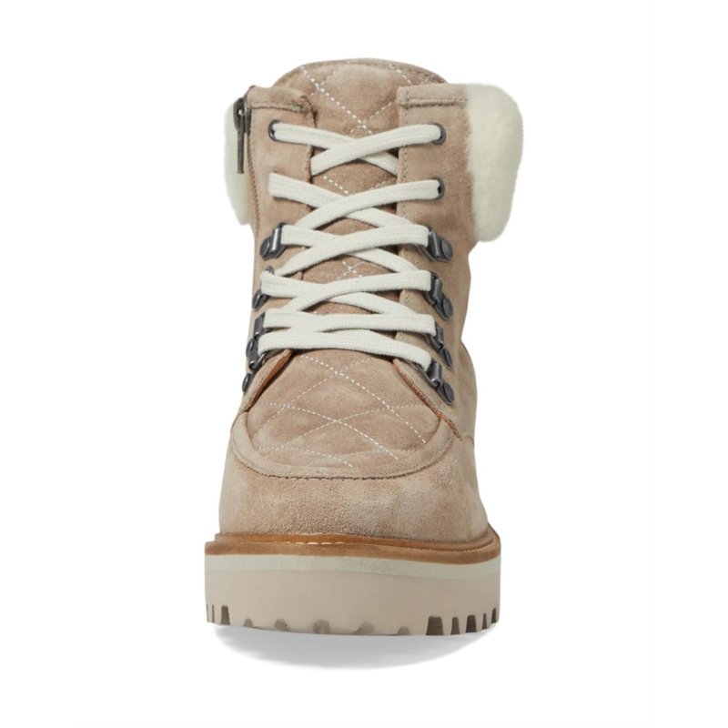 Chic and cozy! The Johnston & Murphy Emmalynn Quilted Hiker boots feature a lace-up closure with a side zipper in a round toe silhouette with, suede upper, genuine shearling collar, and leather and microfiber lining.