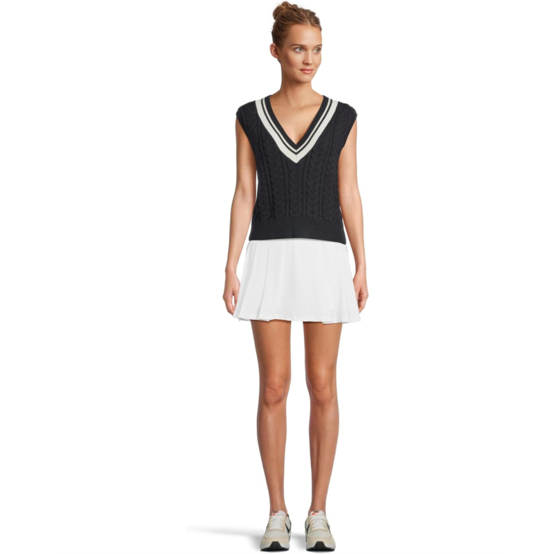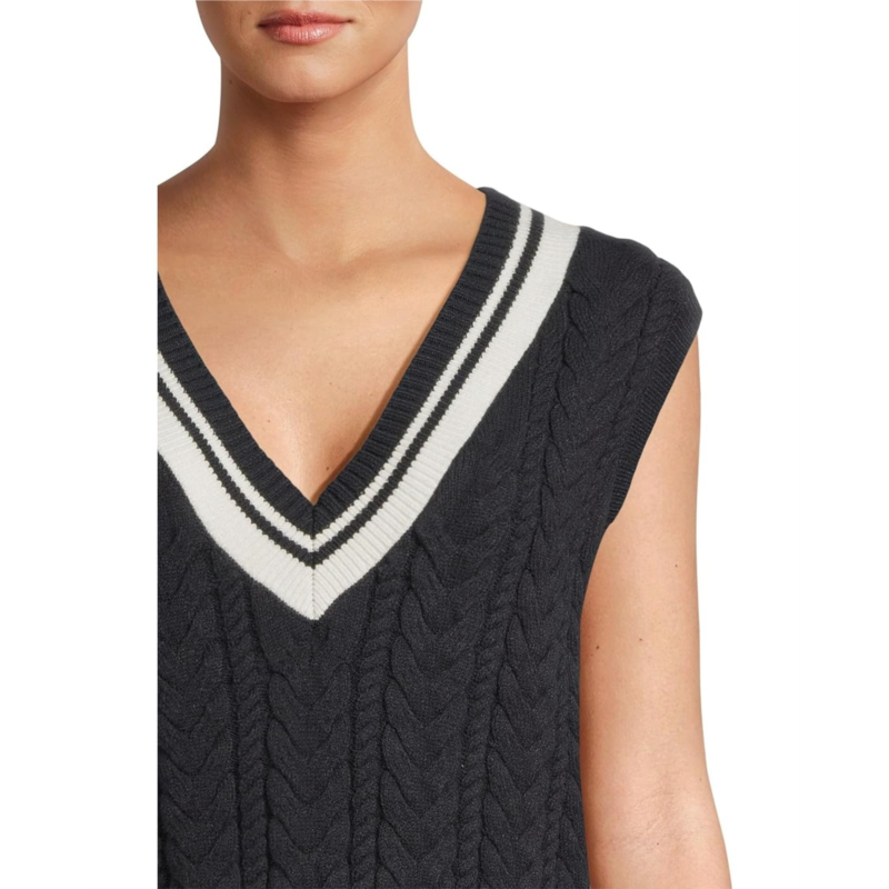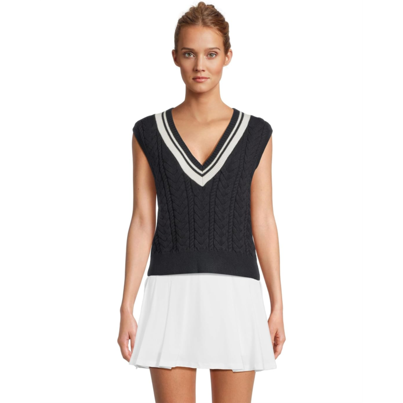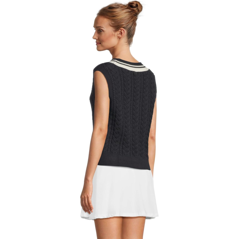 The Beyond Yoga The Cable Knit Vest is a sweater vest that is perfect for a tennis match or running errands. This sleeveless vest is designed with a unique knit pattern, contrast stripe V-neckline for a clean look, and waist length that pairs with any shorts, skirts, or pants. It is styled with a ribbed hemband, neckline, and armhole. East Coast prep meets West Coast cool in this pullover vest.