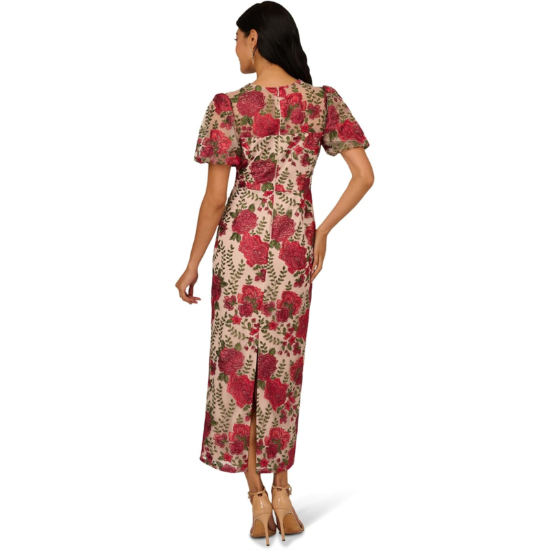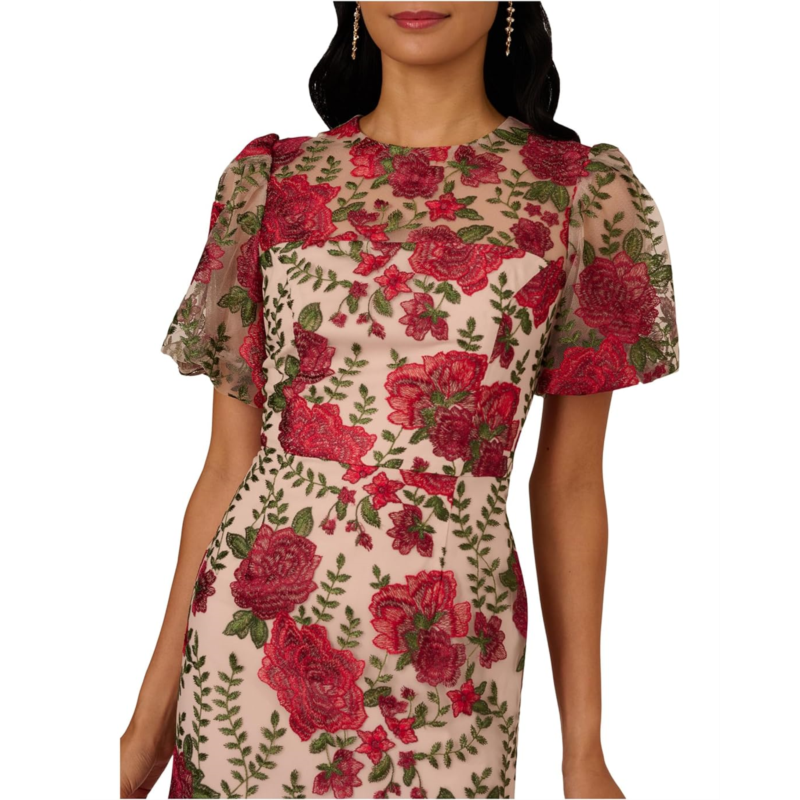 The Adrianna Papell Puff Sleeve Embroidered Dress features short puff sleeves and allover floral embroidery highlight the dress''s structure, offering texture and visual depth. It has a zippered back closure and split back hem for ease of movement.