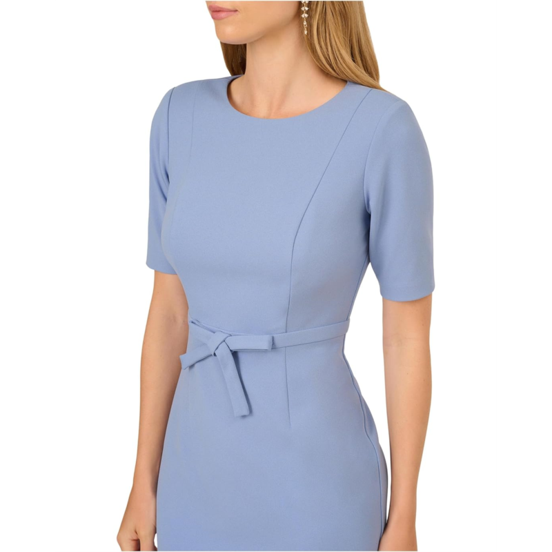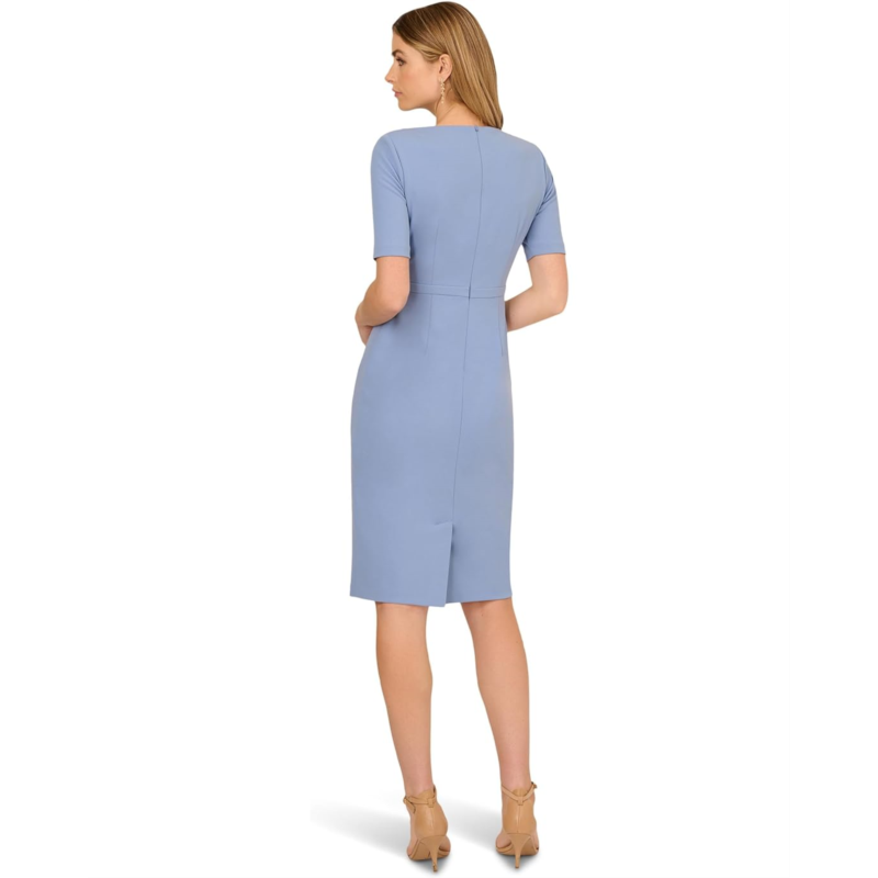 The Adrianna Papell Mini Bow Front Sheath Dress uses crisp crepe fabric to create its clean, elegant lines. Its elbow-length sleeves, a crew neckline, and a knee-length hem keep the design demure, with princess seams and a zippered back closure ensuring a fitted silhouette. A cute bow at the center waistband adds the perfect finishing touch. If you want a moment of vintage glamor in your work and weekend wardrobe, this midi dress is the style for you.