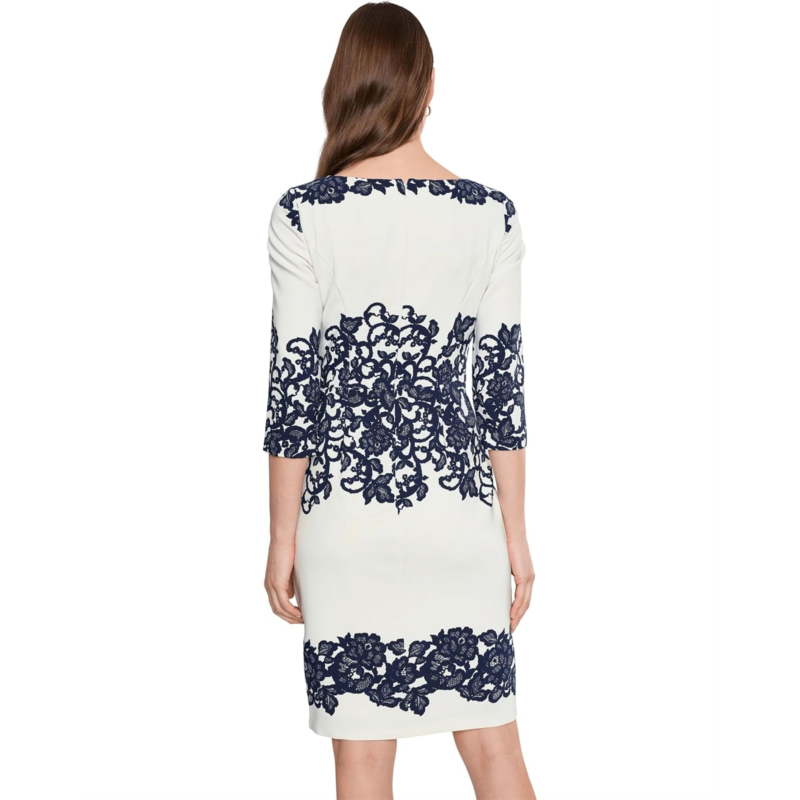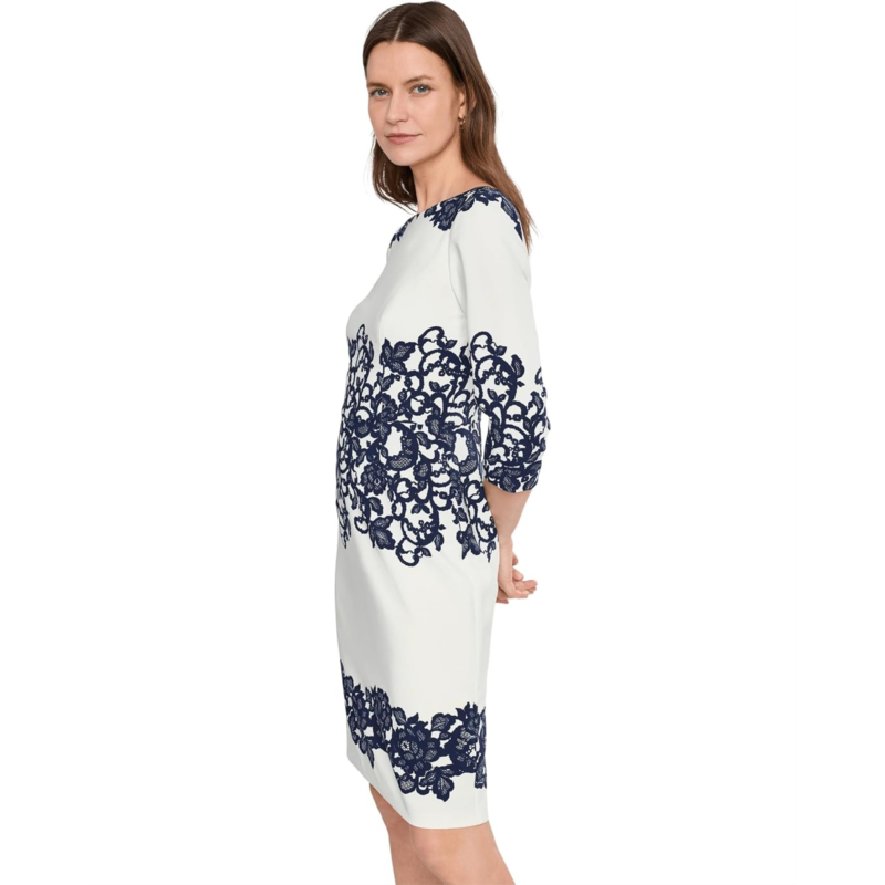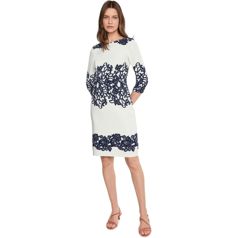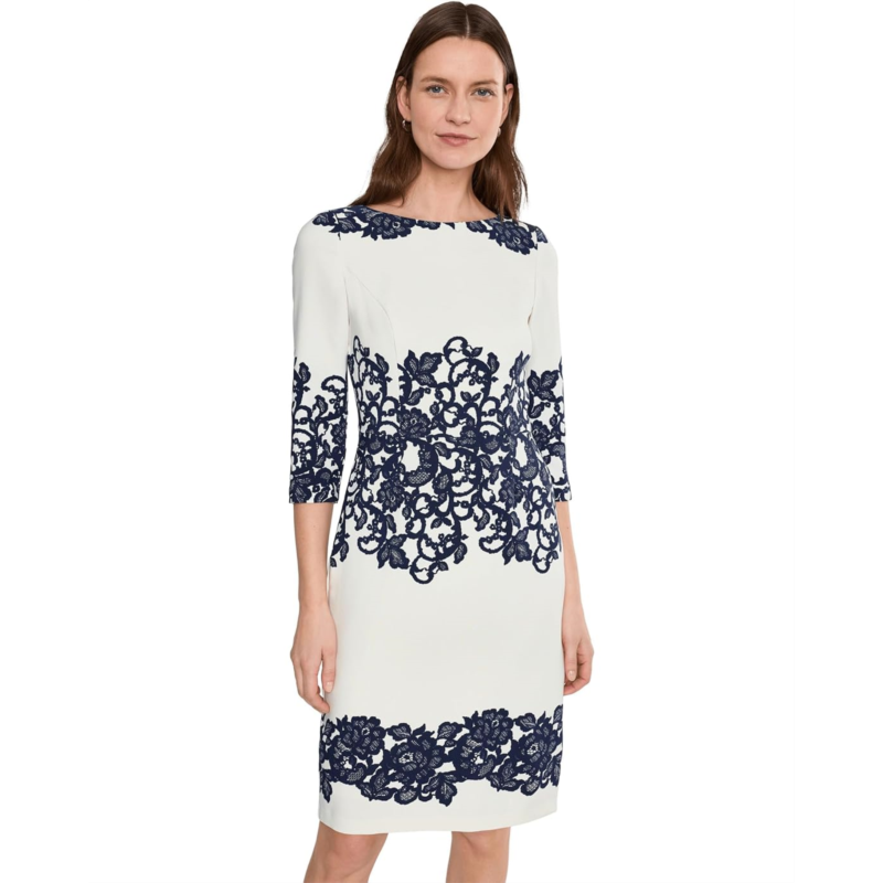 Wave hello to your stylish soul by opting for the classic Adrianna Papell Scroll Lace Short Dress. Featuring floral lace embroidery details, it has a boat neckline and sheath silhouette with rounded hem intended to hit above the knee.