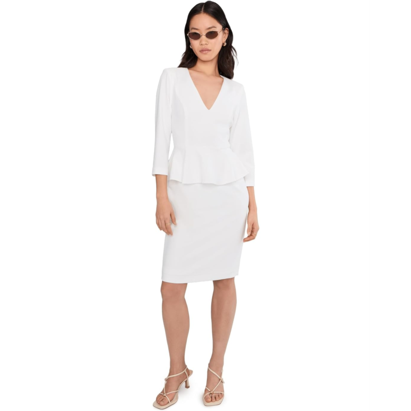 From the desk to dinner, step out in chic style effortlessly in the Adrianna Papell Crepe Peplum Short Dress. Featuring a V-neckline with three-quarter sleeves, back zipper closure and a sheath silhouette.
