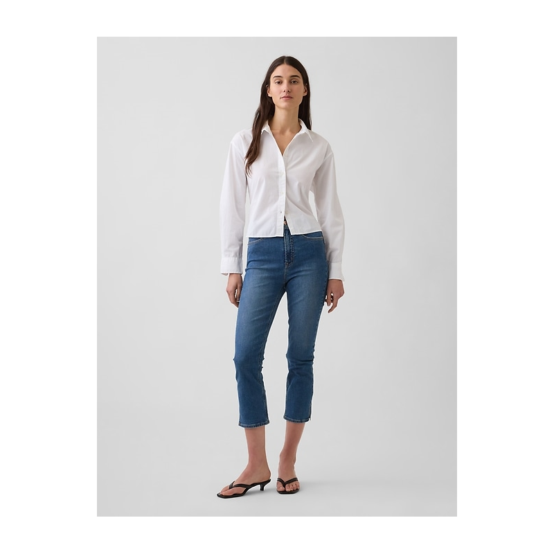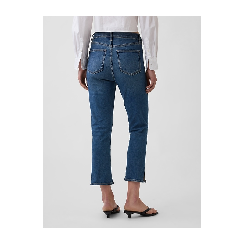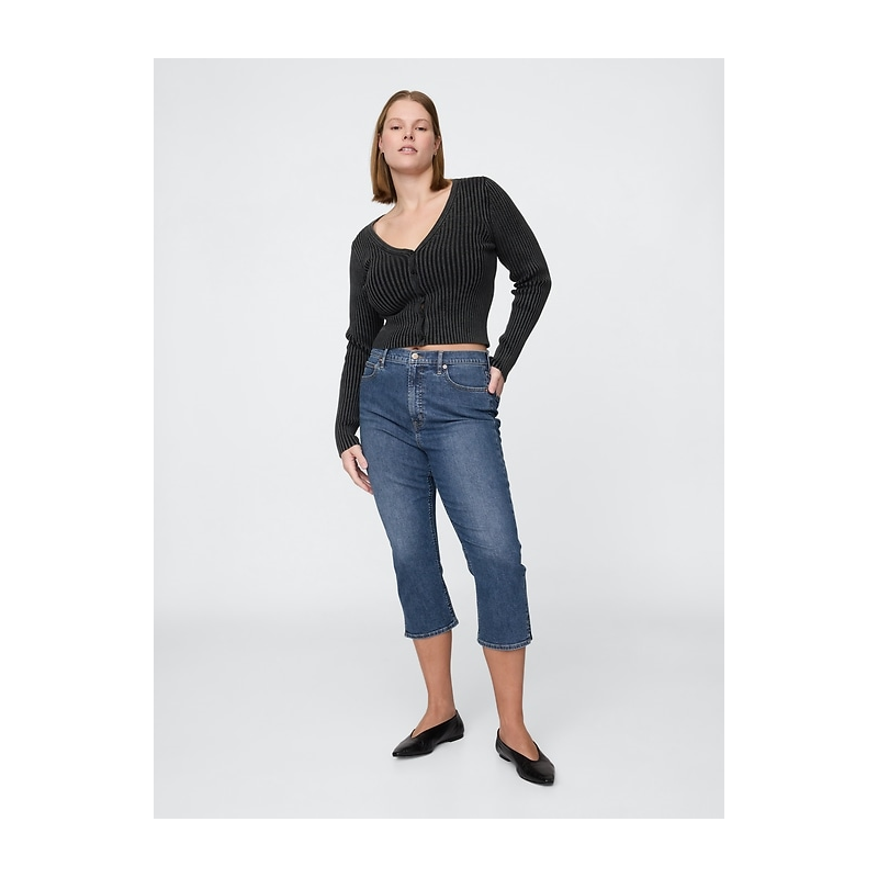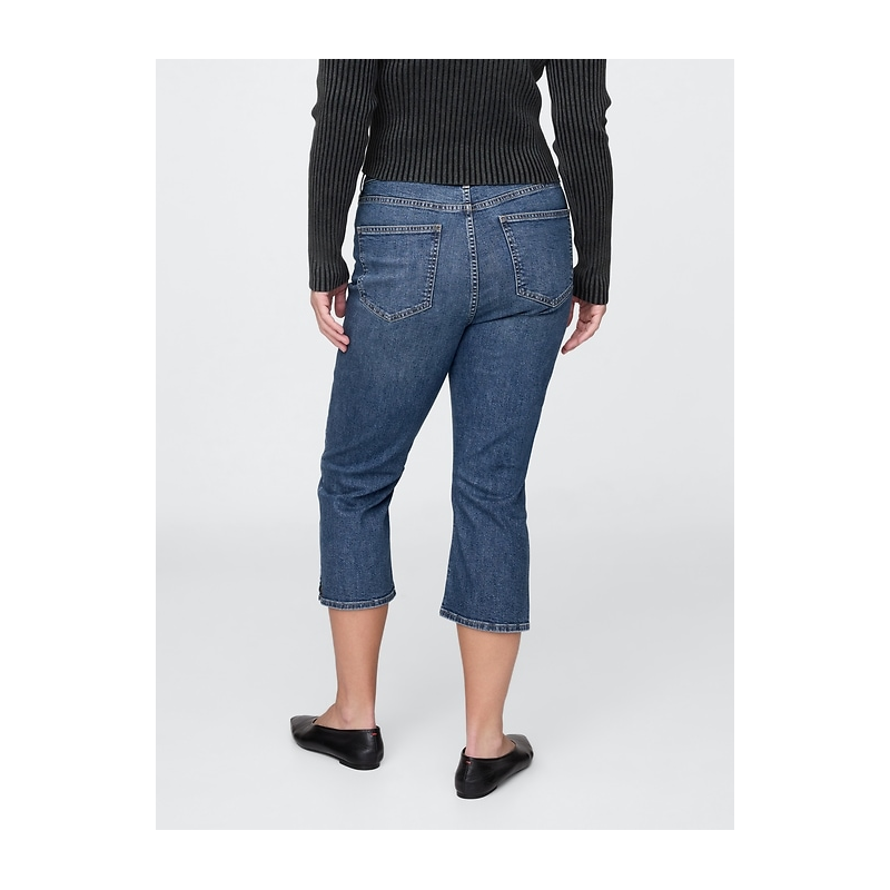Look:A five-pocket capri jean in a medium indigo wash.