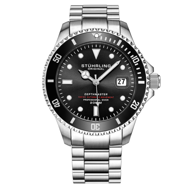 Men''s Swiss Automatic Diver Watch. This watch has a Stainless Steel Case, Black Dial with Highly Luminescent Hands and Markers, and Black 120 Click Unidirectional Rotating Bezel, on a Stainless Steel Bracelet.