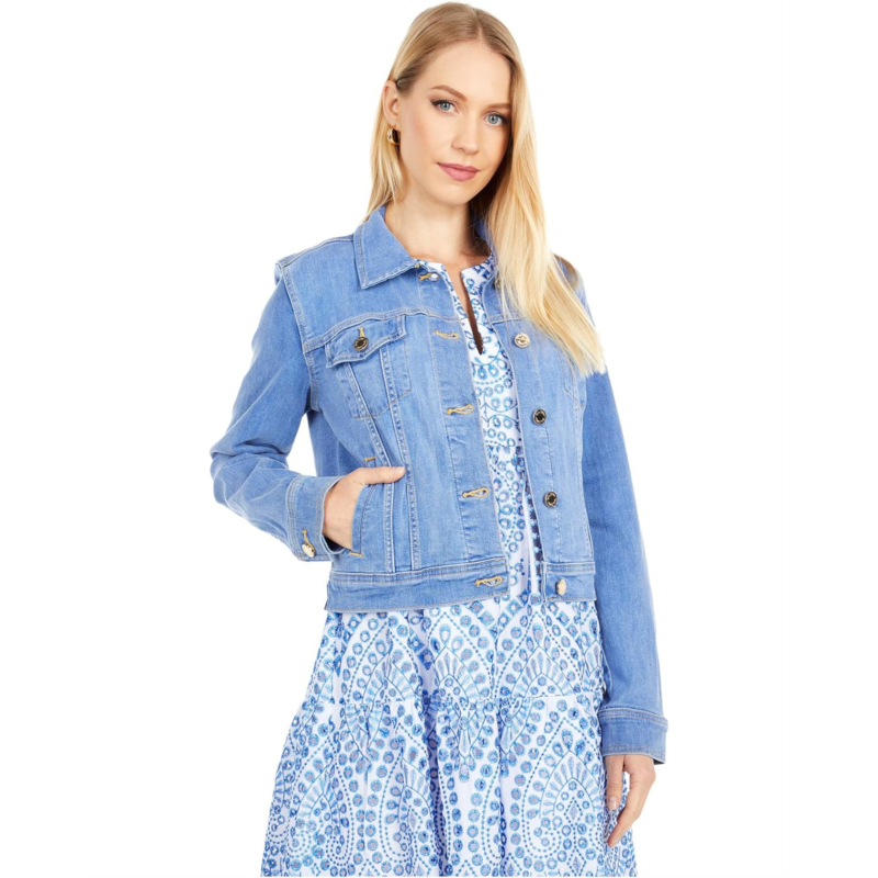 - The Lilly Pulitzer Seaspray Denim Jacket is a must-have look featuring a stretch-denim fabrication with classic gold-logo shanks.