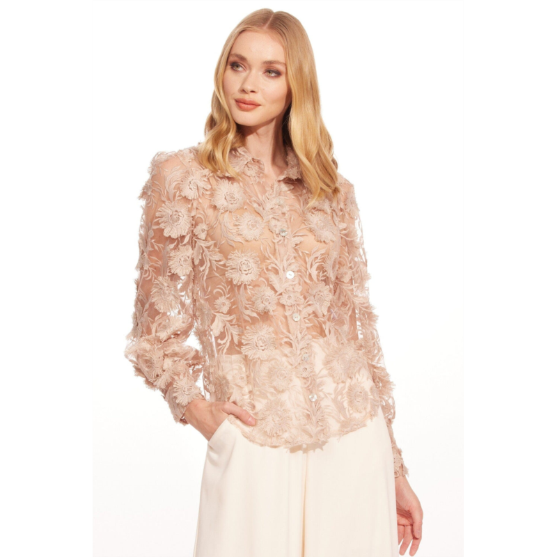 This collared shirt features a lightweight sheer fabric with 3D floral embroidery, finished with button through fastening and long cuffed sleeves.A?