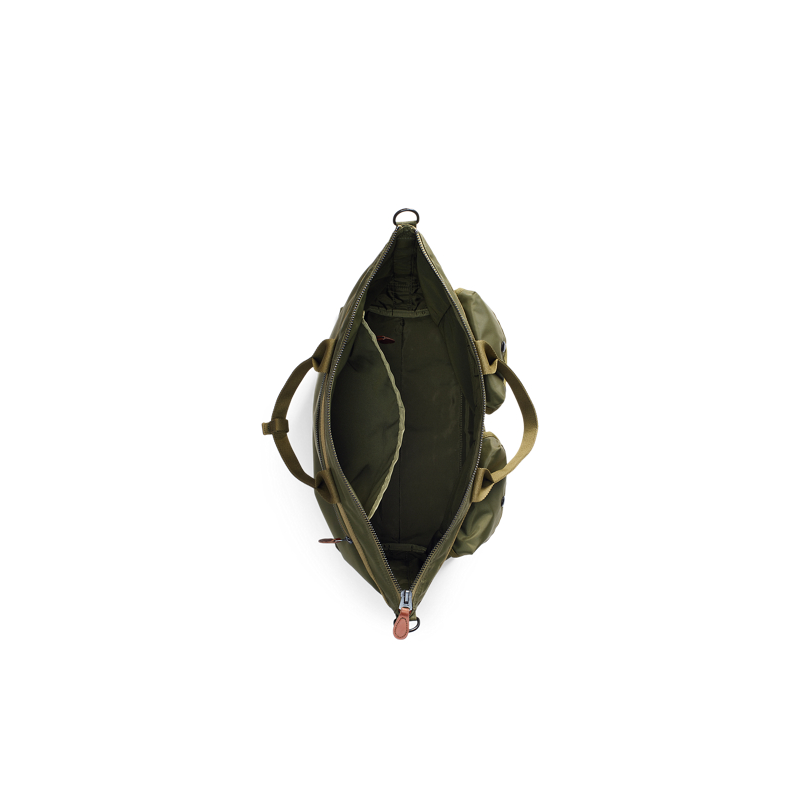 Constructed from durable, yet lightweight recycled nylon canvas. Webbed top handles and removable shoulder strap. Self-lined. Leather zipper pulls. Solid brass hardware with a black oxidized finish.
