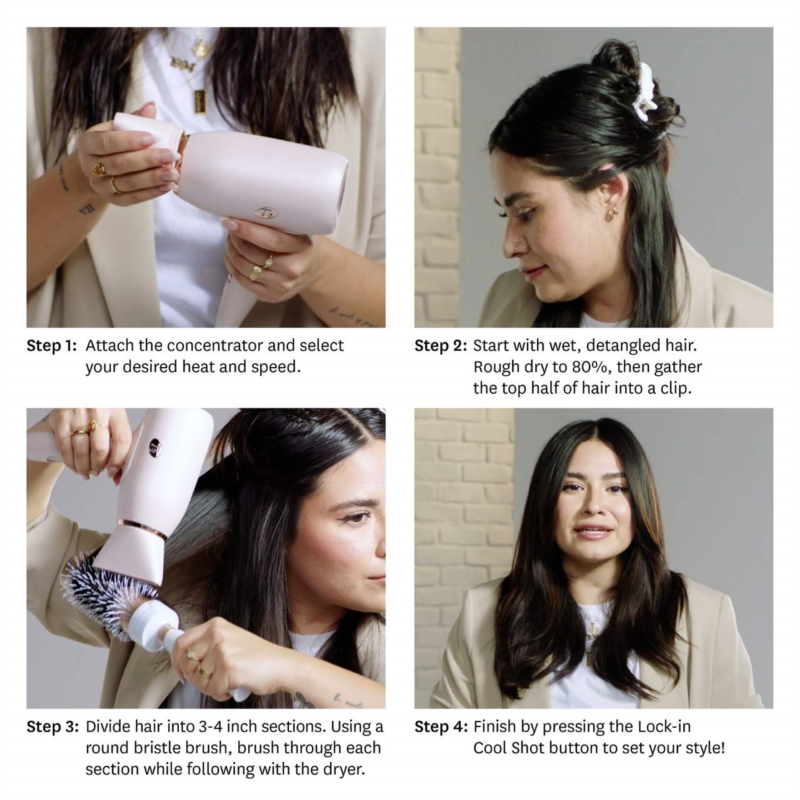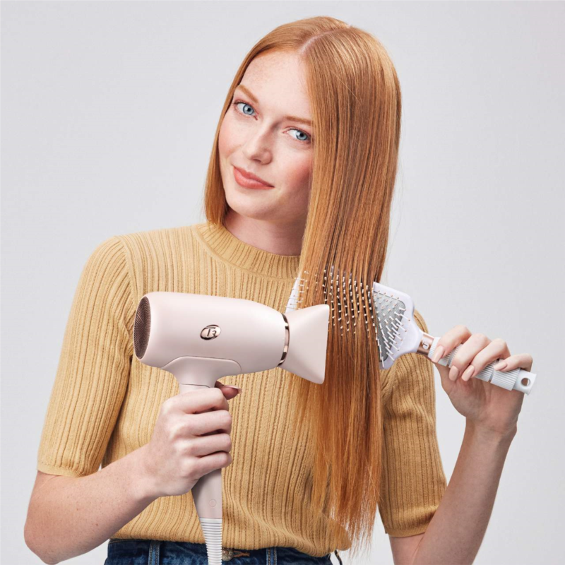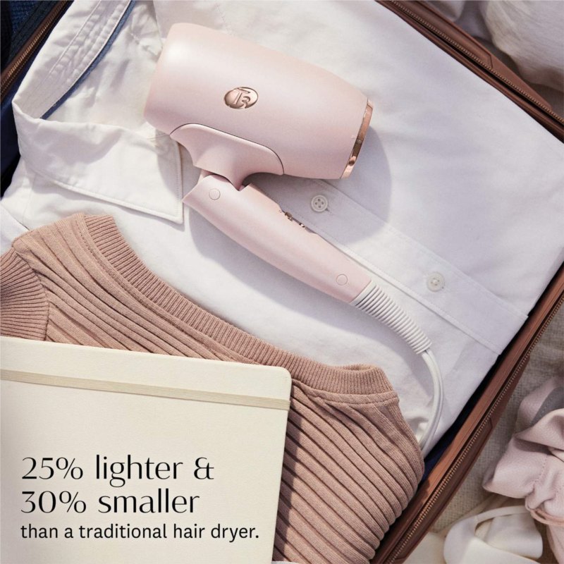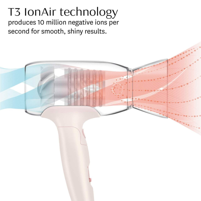 What Else You Need to Know: T3 IonAir advanced airflow technology emits ion-rich air to dry large sections of hair quickly and gently. The compact body and folding handle allow for easy storage in small spaces while traveling, and the auto-dual voltage automatically adapts for worry-free styling abroad.