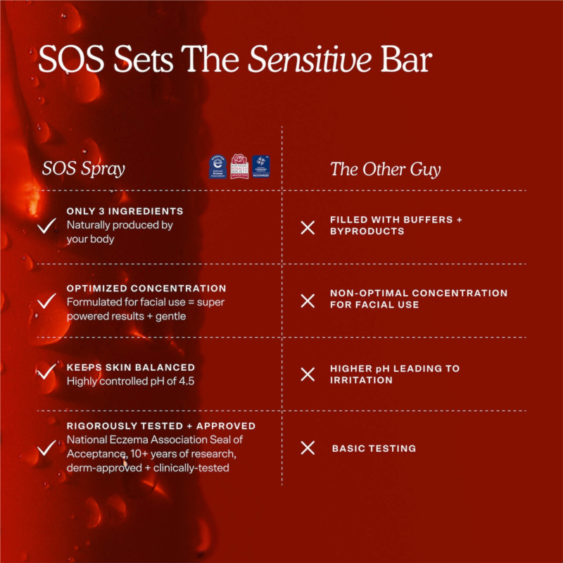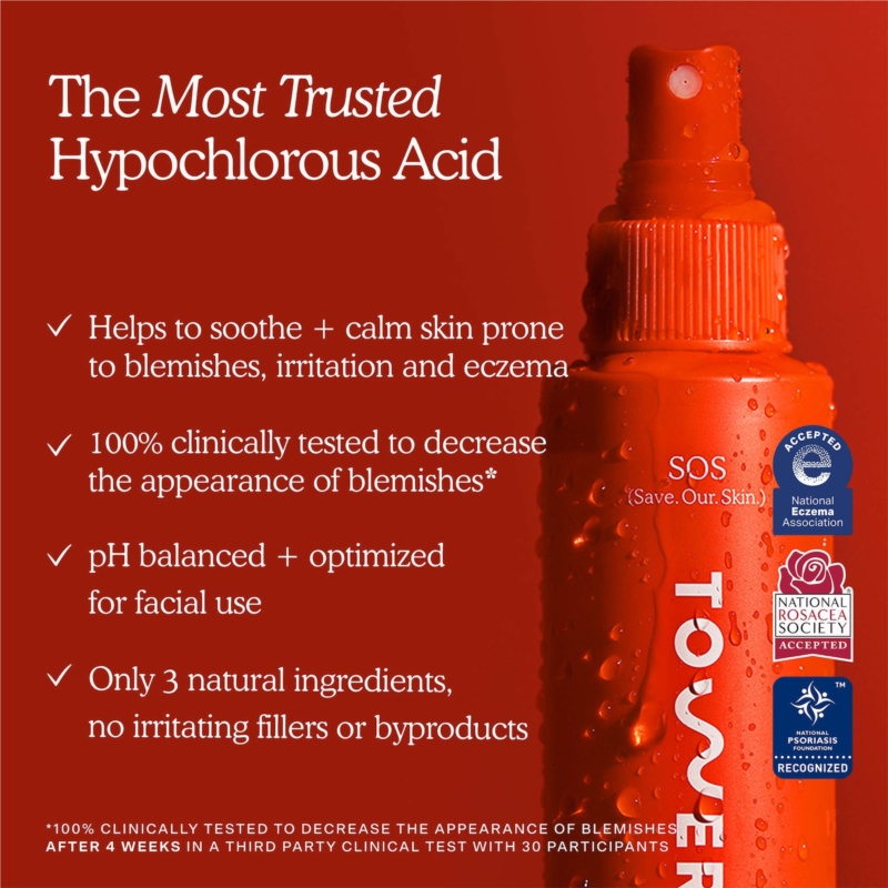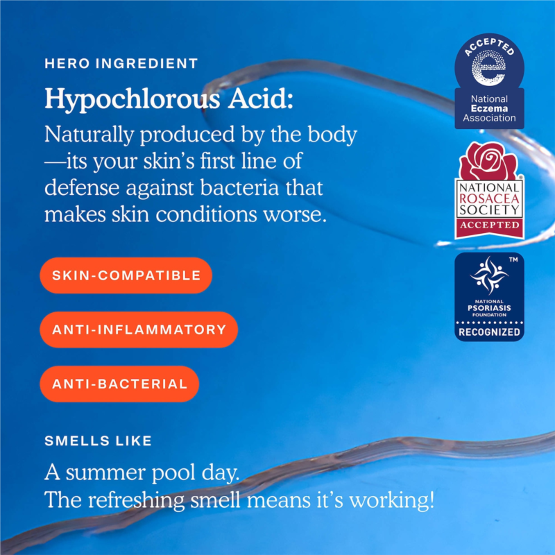 What Else You Need to Know: The only hypochlorous acid spray recognized by all three leading U.S. skin health organizations?Eczema, Rosacea, and Psoriasis?it’s formulated specifically for facial use to deliver maximum results with minimal irritation. Think of it as a reset button for stressed-out skin whether you''re dealing with breakouts, post-workout sweat, or an eczema flare-up. The more you spray, the better it works. Bring this travel-friendly mini in your gym bag, on the plane, and on your daily commute. It''s pH balanced (4.5), alcohol-free, fragrance-free and safe to use all over the body.