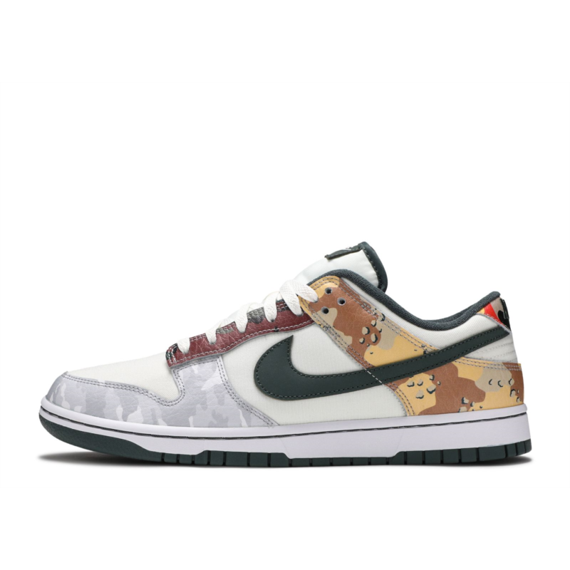 The Dunk Low SE ''Sail Multi-Camo'' brings unique overlays to its classic skate construction. Built with a white textile base, the shoe''s uppers emerge with mismatched camouflage design, sporting a mix of orange yellow on the forefoot of the right shoe, with burgundy and green on the heel. The left shoe instead emerges with a greyscale forefoot and desert camo on the heel, while the mismatched heel patches include a Nike wordmark on the left shoe and a basketball graphic on the right. Dark green accents complement both shoes on the tongue tag, collar lining, Swoosh and concentric rubber outsole.