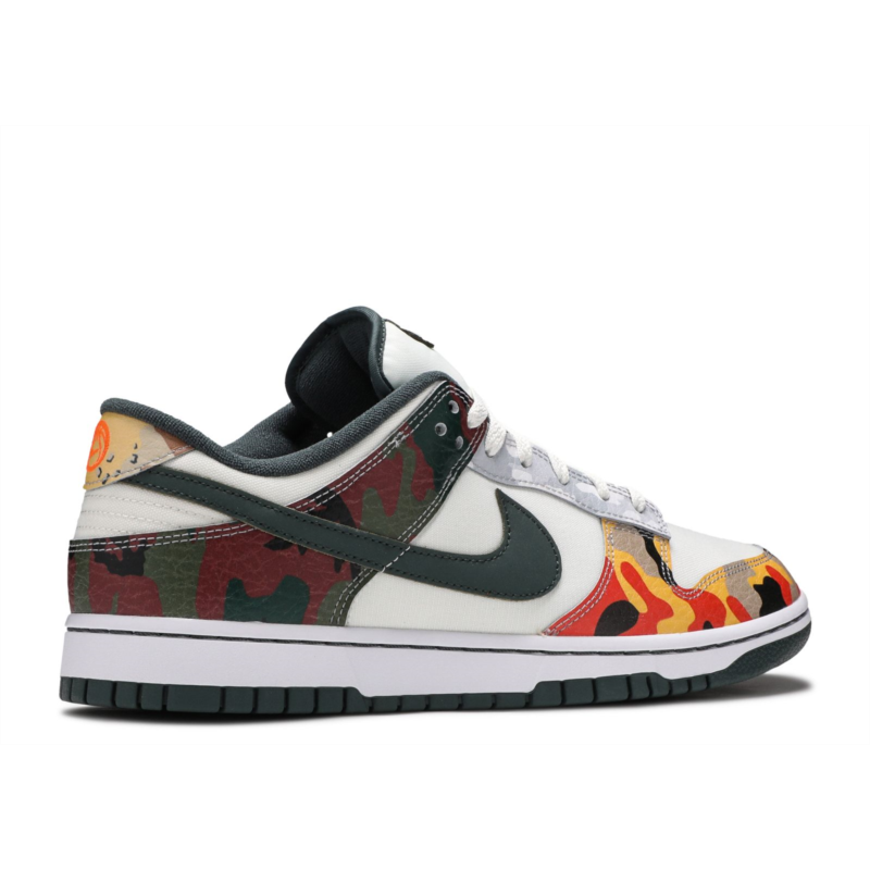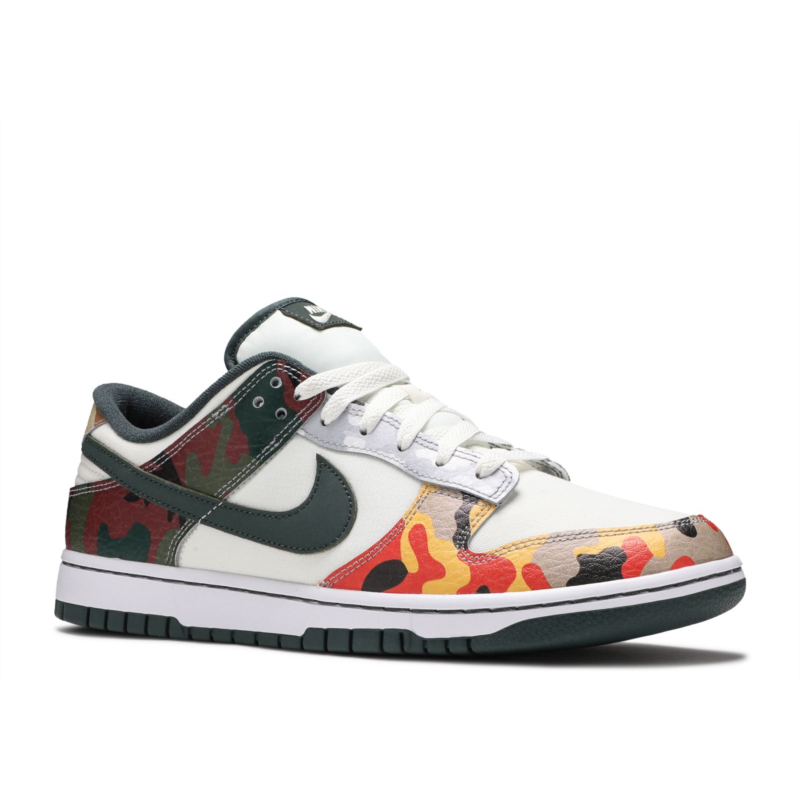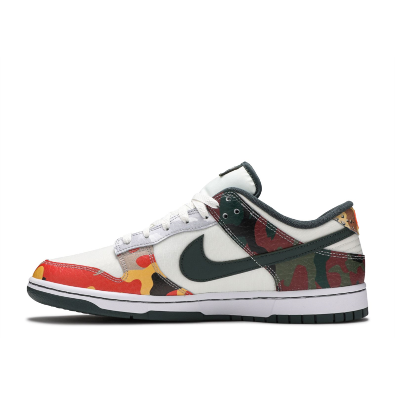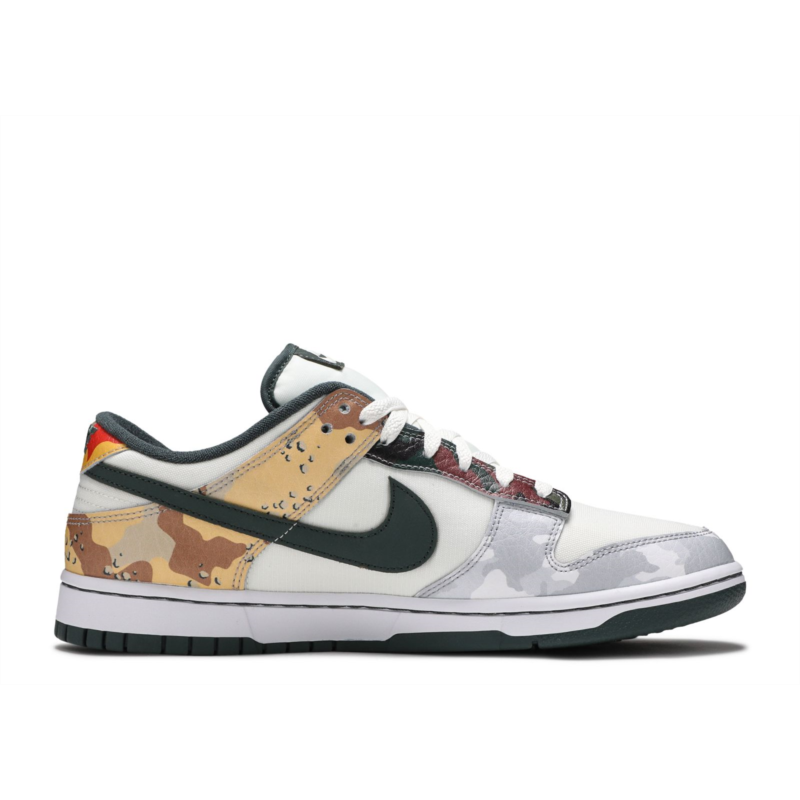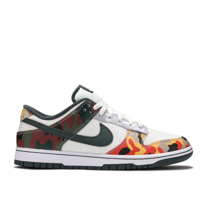 The Dunk Low SE ''Sail Multi-Camo'' brings unique overlays to its classic skate construction. Built with a white textile base, the shoe''s uppers emerge with mismatched camouflage design, sporting a mix of orange yellow on the forefoot of the right shoe, with burgundy and green on the heel. The left shoe instead emerges with a greyscale forefoot and desert camo on the heel, while the mismatched heel patches include a Nike wordmark on the left shoe and a basketball graphic on the right. Dark green accents complement both shoes on the tongue tag, collar lining, Swoosh and concentric rubber outsole.