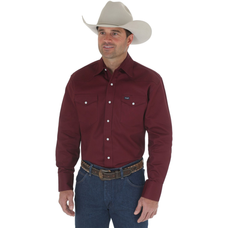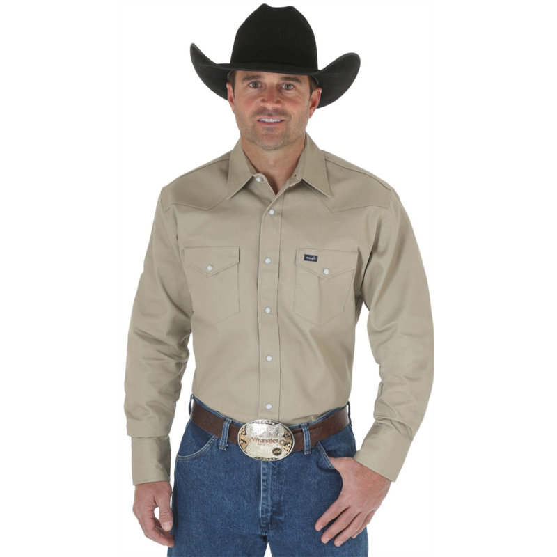 At work or at play, the WranglerA Men''s Cowboy CutA Long Sleeve Shirt looks and feels great. The authentic Western styling of the front and back yokes, the 3-snap cuffs and the spread collar make this shirt stylish, while the 100% cotton material provides comfort. 100% cotton, 7-1/4 oz. solid twill material with firm finish provides long-lasting comfort