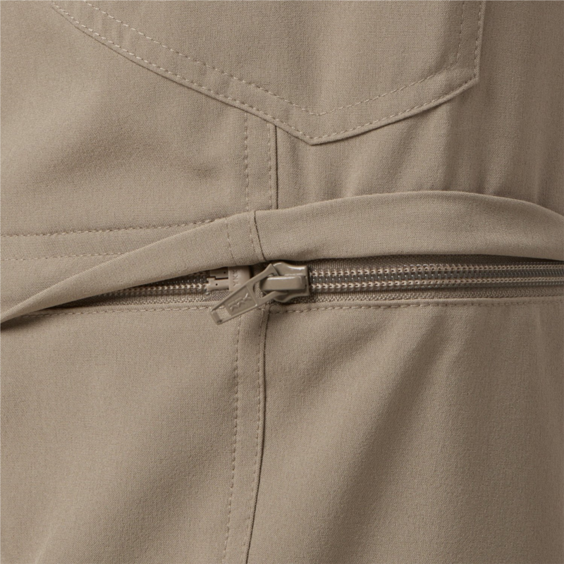 Elastic waist and front-fly combo offers a custom fit