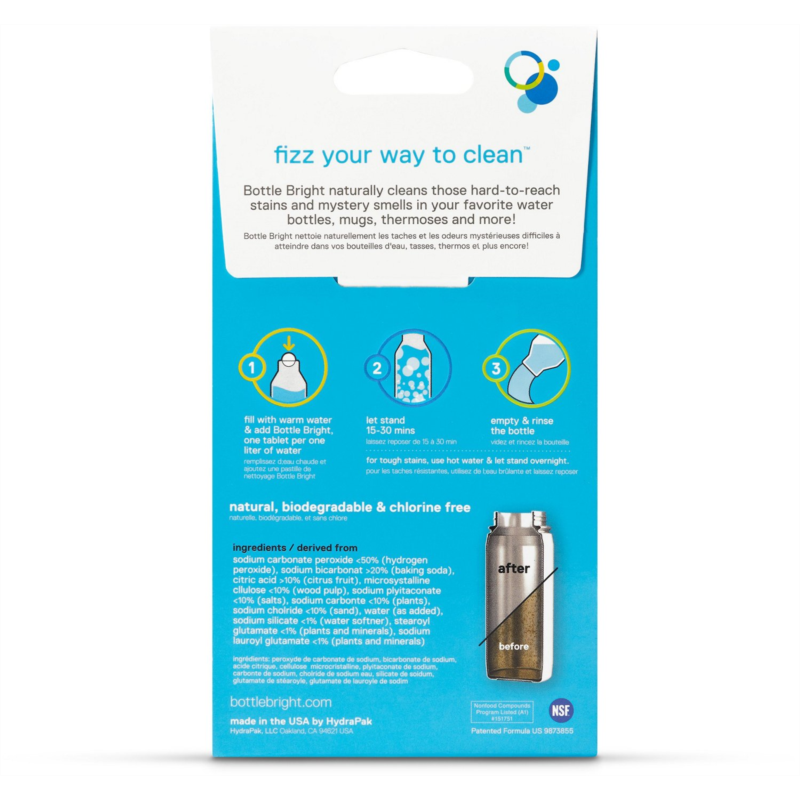 Keep your water bottle fresh and clean with the HydraPak Bottle Bright All-Natural Cleaning Tablet 12-Pack. These tablets clean the inside of your bottle without leaving a residue or taste, and are biodegradable once discarded. The tablets are individually wrapped and work on nearly any surface including stainless steel, TPU, glass, porcelain and silicone. 12-pack of cleaning tablets keep your water bottle clean and clear