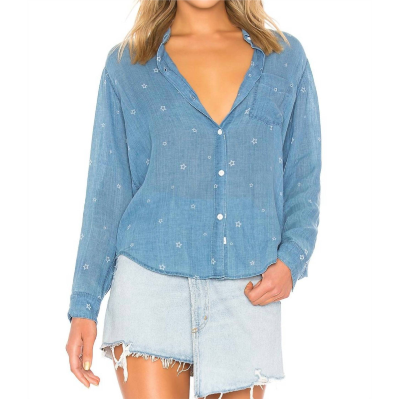 This button down shirt is comfortable yet polished.Super soft and lightweight long sleeve denim button-down top with white star detail. 70% Tencel / 30 Linen. Imported. CARE / Machine Wash Cold. Tumble Dry Low. Remove Promptly. No Bleach.