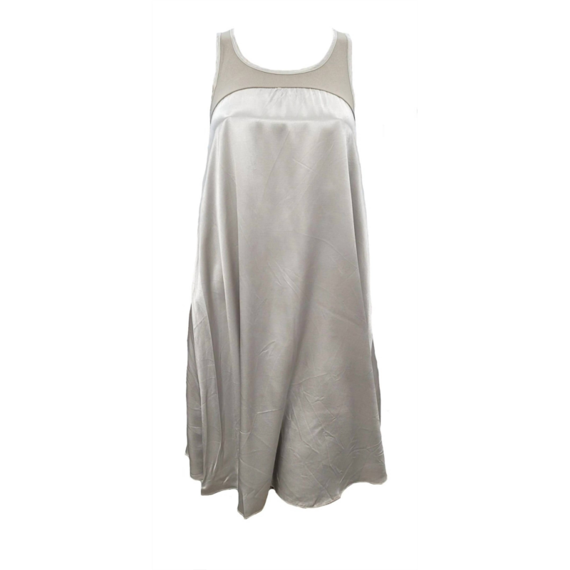 Loose cut flares to hemline. Upper portion is made of rib-knit Supima cotton blend. Body and trim around neckline and arm holes are woven satin.