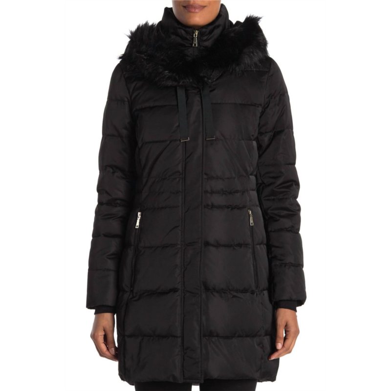 T Tahari stefani faux fur hood down fill fitted puffer coat in black
