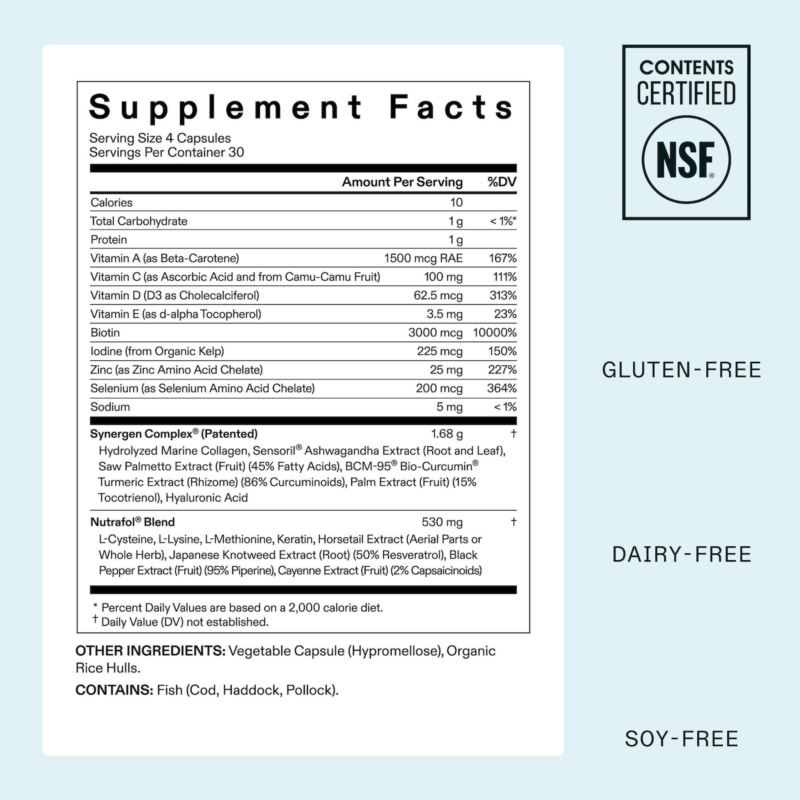 What Else You Need to Know: This number one dermatologist-recommended hair growth supplement brand (3) is physician-formulated to target multiple key root causes of hair thinning such as stress, lifestyle, and nutrition. It does not contain gluten, dairy, soy, hormones, drugs, and artificial additives and it is also non-GMO, halal, and comes in PCR and recyclable packaging. Nutrafol Hair Growth Nutraceuticals are third-party certified by NSF, adding another layer of trust with toxicology reviews, ingredient testing, label verification, manufacturing facility inspections, and regular audits.