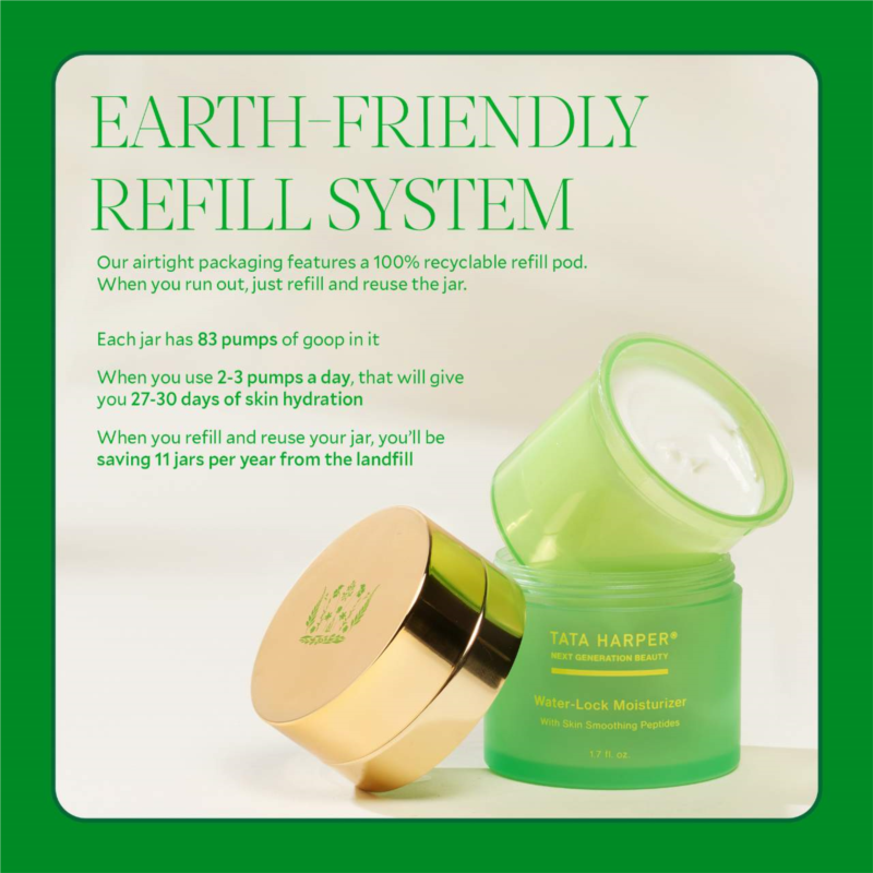 Hydrate more, waste less. Water-Lock Moisturizer is engineered with a sustainable refill system to reduce overall waste. When you run out, get the refill pod. Each refill pod provides 30 days of skin smoothing hydration. If you opt for the refill cup, you can save 11 jars from going into the landfill each year.