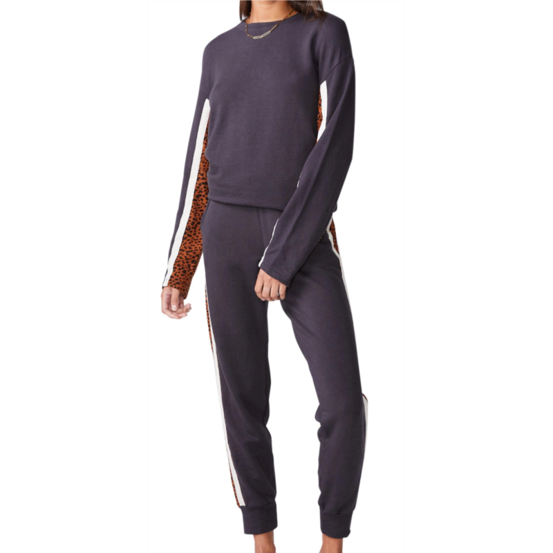 No gym necessary for these cool-girl joggers. Monrow Supersoft fleece sweatpants with animal-print contrast panels. Elasticized waistband. Side slip pockets. Slim legs. Banded cuffs. Pull-on style. Rayon/cotton/spandex. Made in USA.