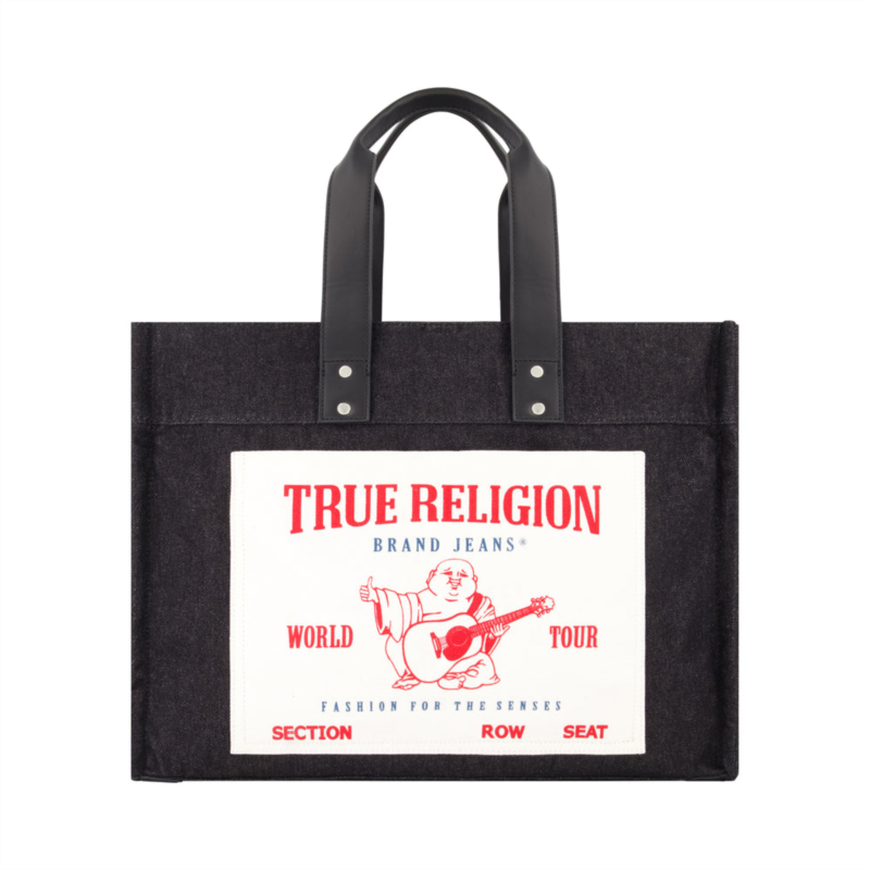 Keep your belongings safe and secure with this cute and stylish reusable travel tote bag. This tote bag has a spacious main compartment with a front slip pocket to store your belongings, and a magnetic snap closure to keep your valuables secure inside. These tote bag purses feature top carrying handles with a 8 inch drop, and this tote shoulder bag measures 13.5 H x 18 W x 8 D in inches.-This tote handbag features a stylish and fashionable denim aesthetic with a large True Religion logo, making it perfect for work, beach trips, the gym, or traveling-8'' Handle drop-Silver Hardware-Magnetic snap closure-True Religion Signature polyester lining-Exterior - Front slip pocketInterior - 1 Slip pockets on right side, 1 Slip pocket on left side, 1 Slip pocket on front wall. 1 Zip pocket on back wall.-Material Shell - 50% polyester, 50% cotton. Lining - 100% polyester-Dimension - 13.5H X 18W X 8D