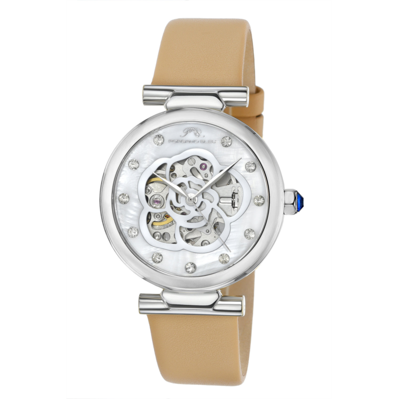 Porsamo Bleu Laura Ladies'' Automatic Watch With Stainless Steel Case And Genuine Leather Black Strap; With Topaz Hour Markers; Mother Of Pearl Skeleton White Dial; Silver Tone & Beige