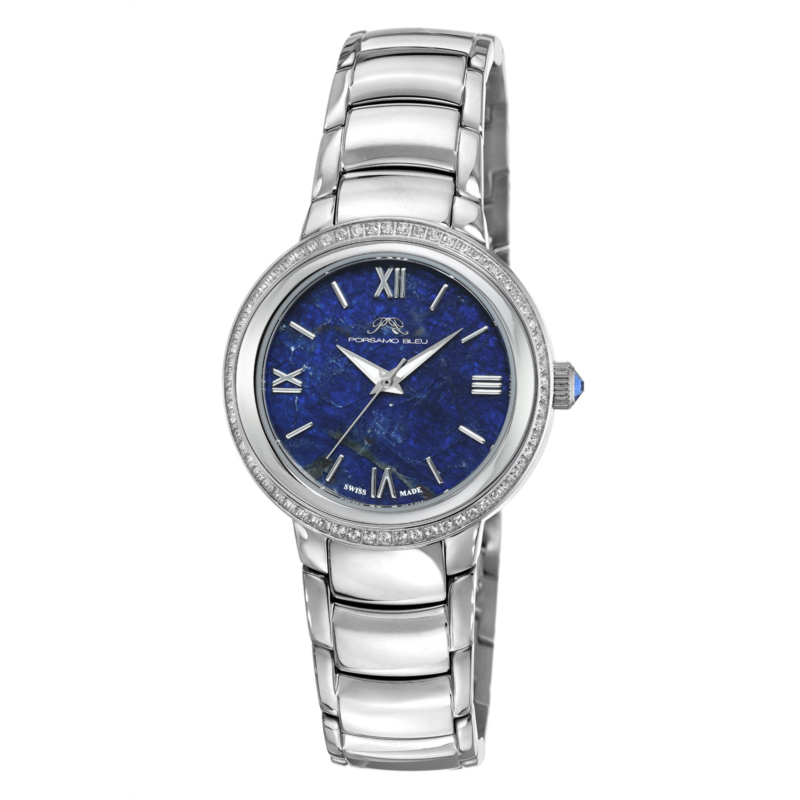 Porsamo Bleu Luna Ladies'' Watch With Topaz Gemstone Inlaid Stainless Steel Bezel; Genuine, Natural Sodalite Gemstone Dial; Silver Tone
