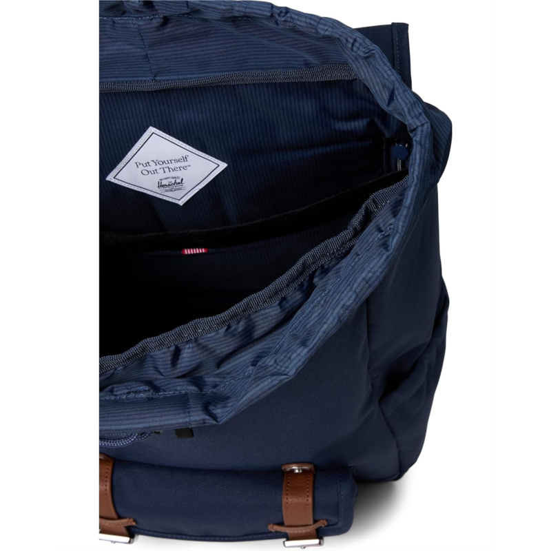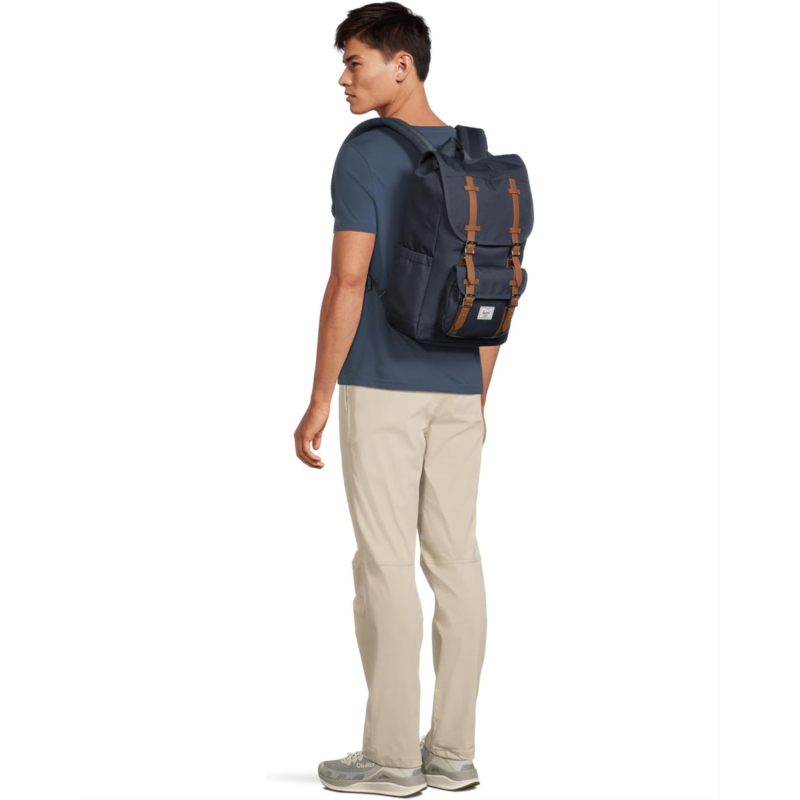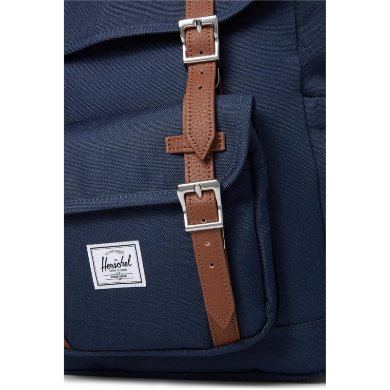 - Pack your bag and get ready to hit the road carrying the Herschel Supply Co. Little America Mid Backpack. It boasts EcoSystem 600D Fabric made from 100% recycled post-consumer water bottles. It has padded and adjustable shoulder straps, and interior and exterior pockets, and buckle closure.